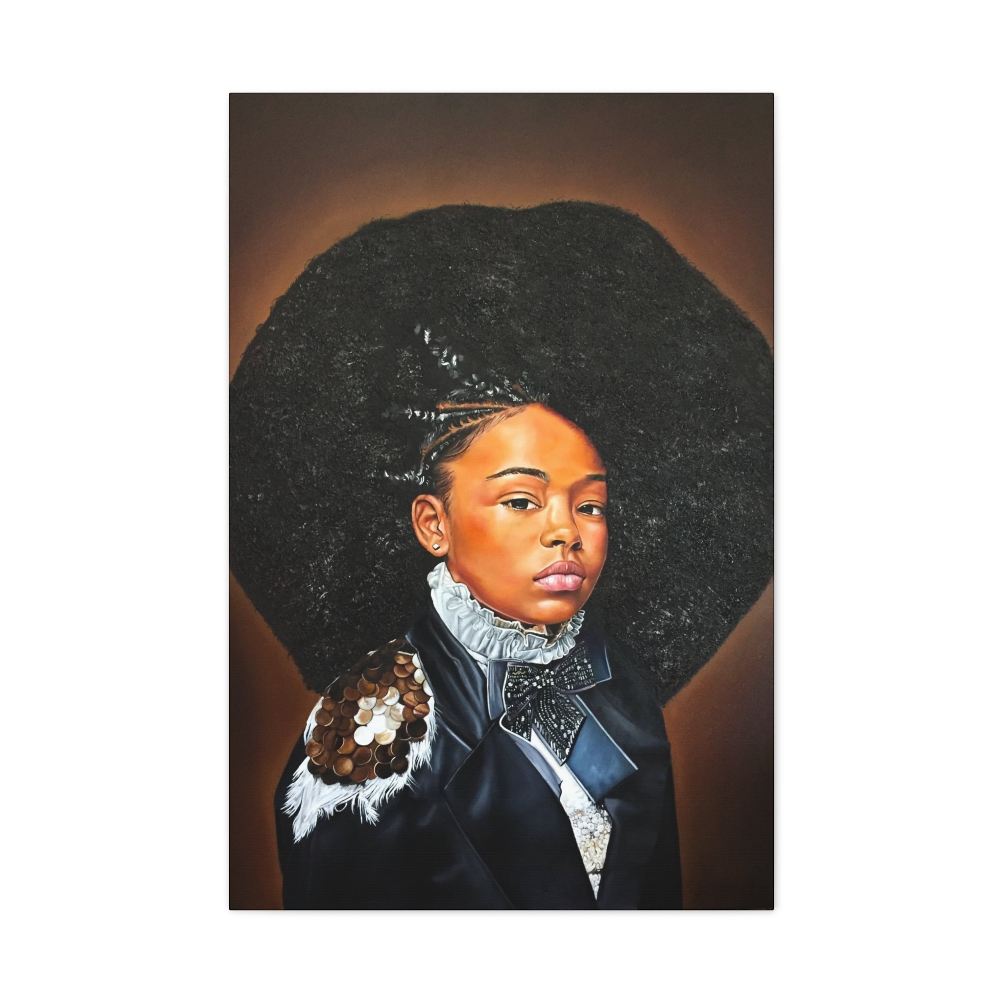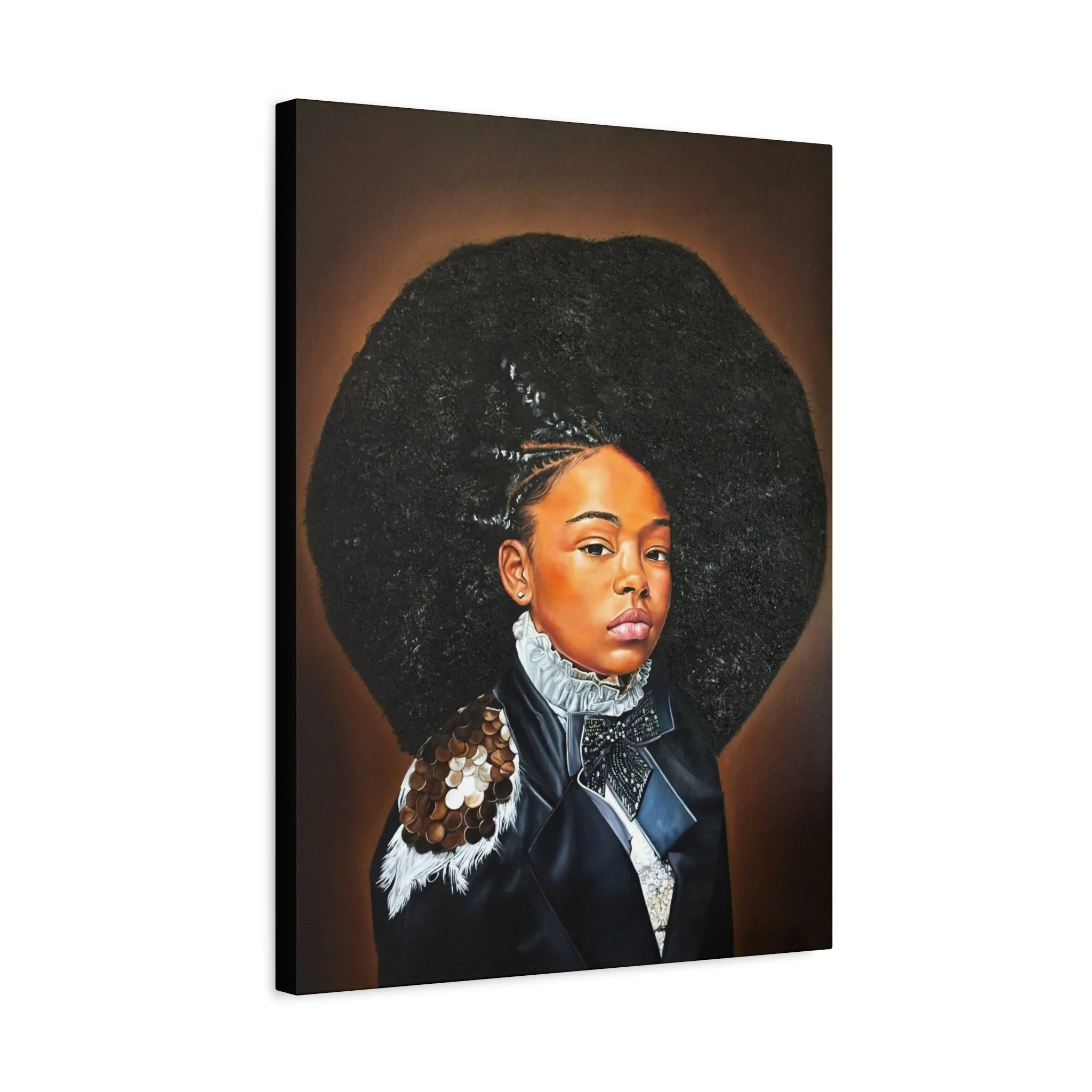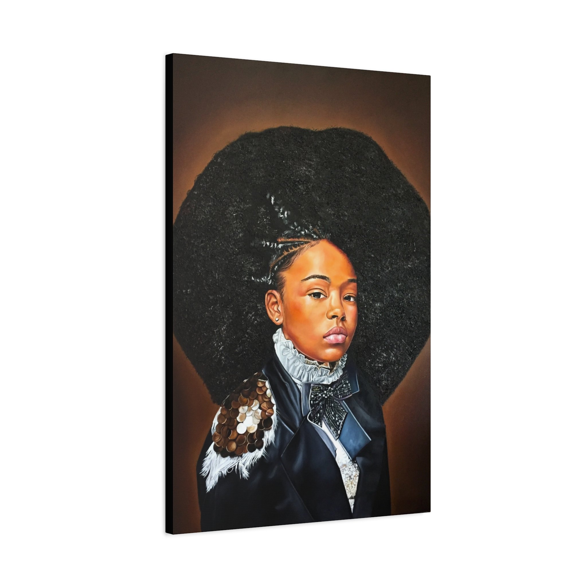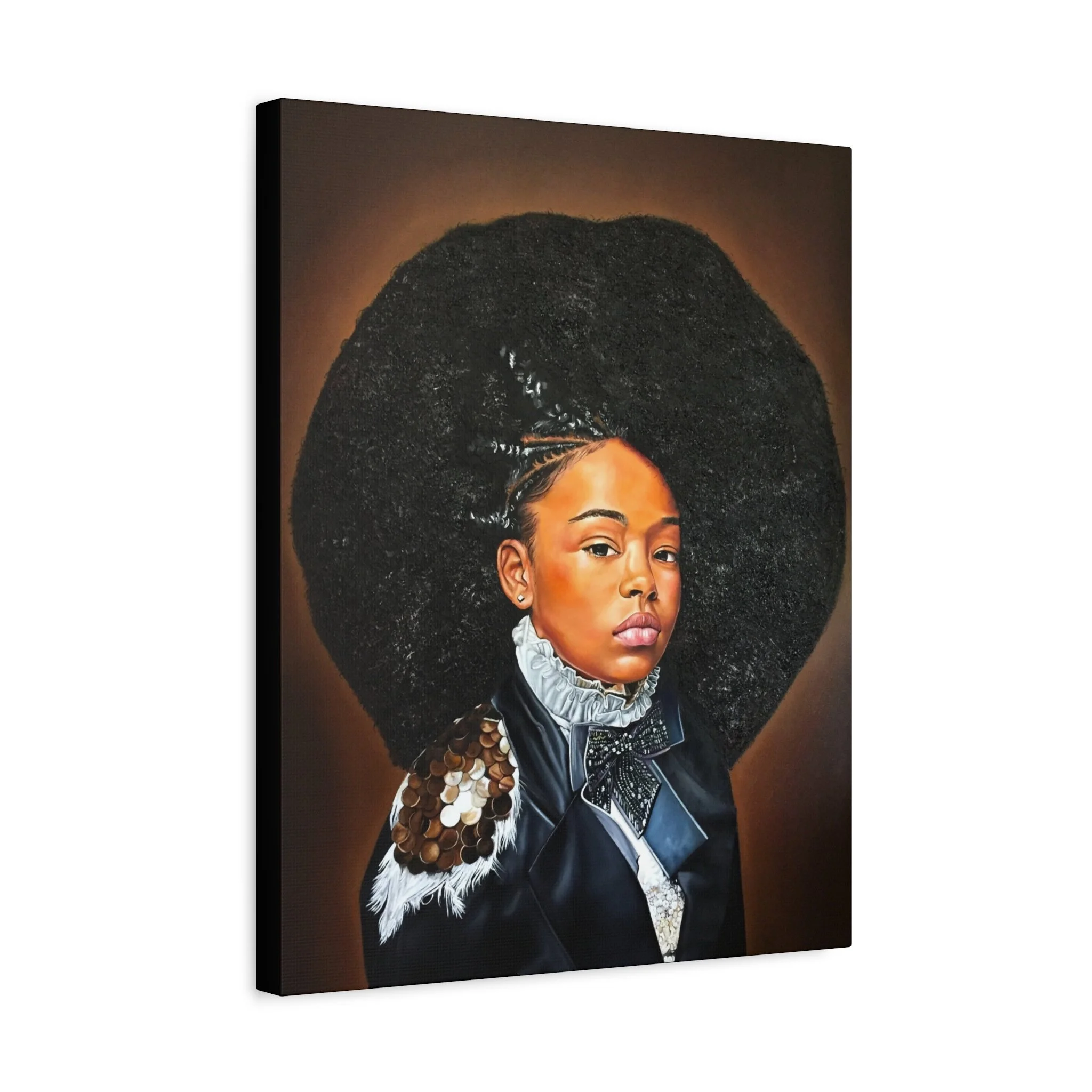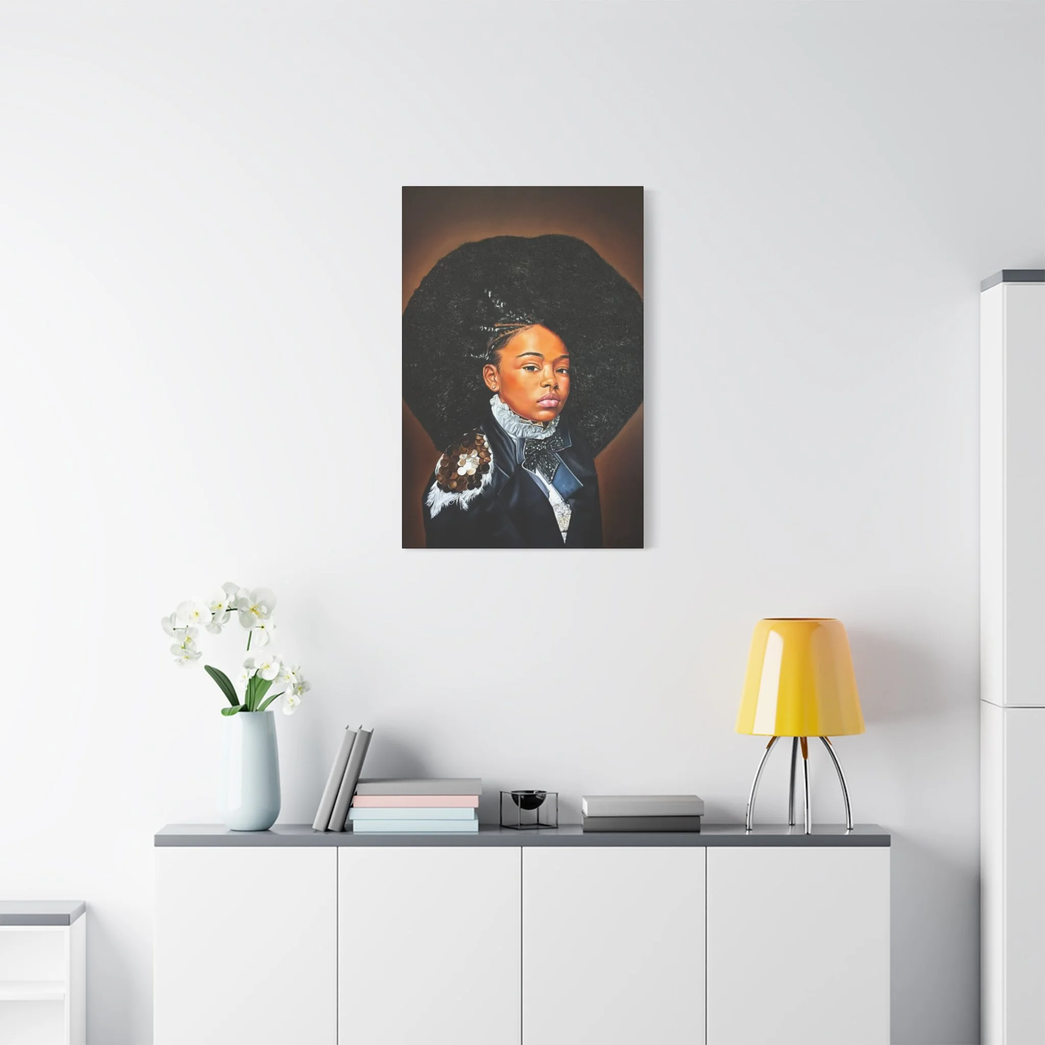 A striking stretched canvas print that brings presence and pride to any room. The portrait captures a young Black woman with a regal bearing and a voluminous natural afro framed against a warm halo — rendered with rich tones and fine detail that pop on a matte surface. The 1.25" profile gives the piece gallery-style depth while the soft matte finish reduces glare and lends an intimate, museum-quality feel. This canvas fits into living rooms, home offices, and entryways where art that celebrates heritage and confidence belongs. Hang it as a bold focal point above a mantle or sofa, or pair it with complementary neutrals for a curated gallery wall that feels thoughtful and lived-in.