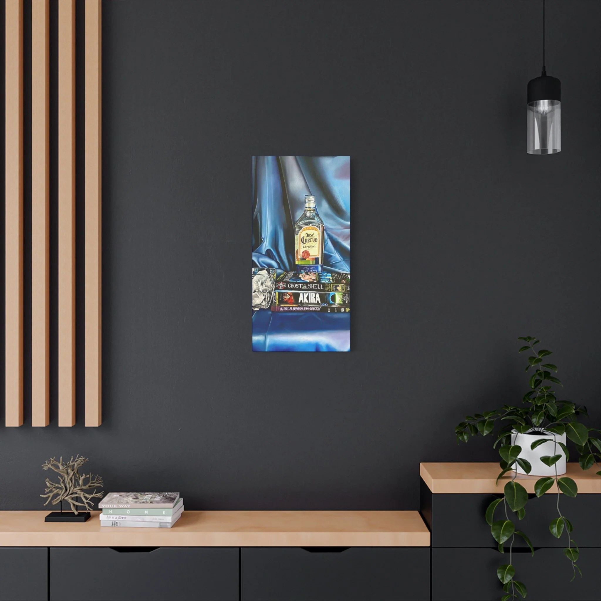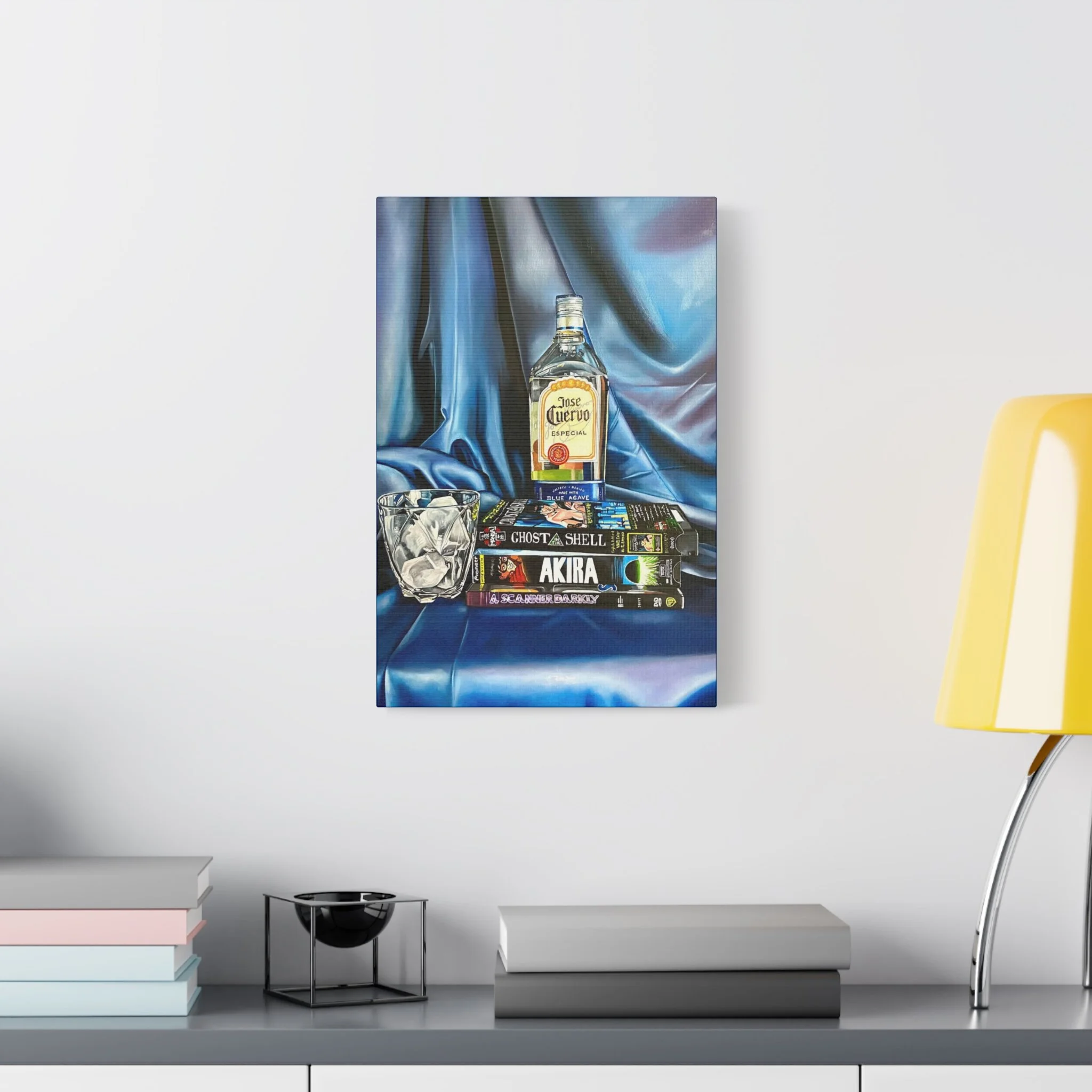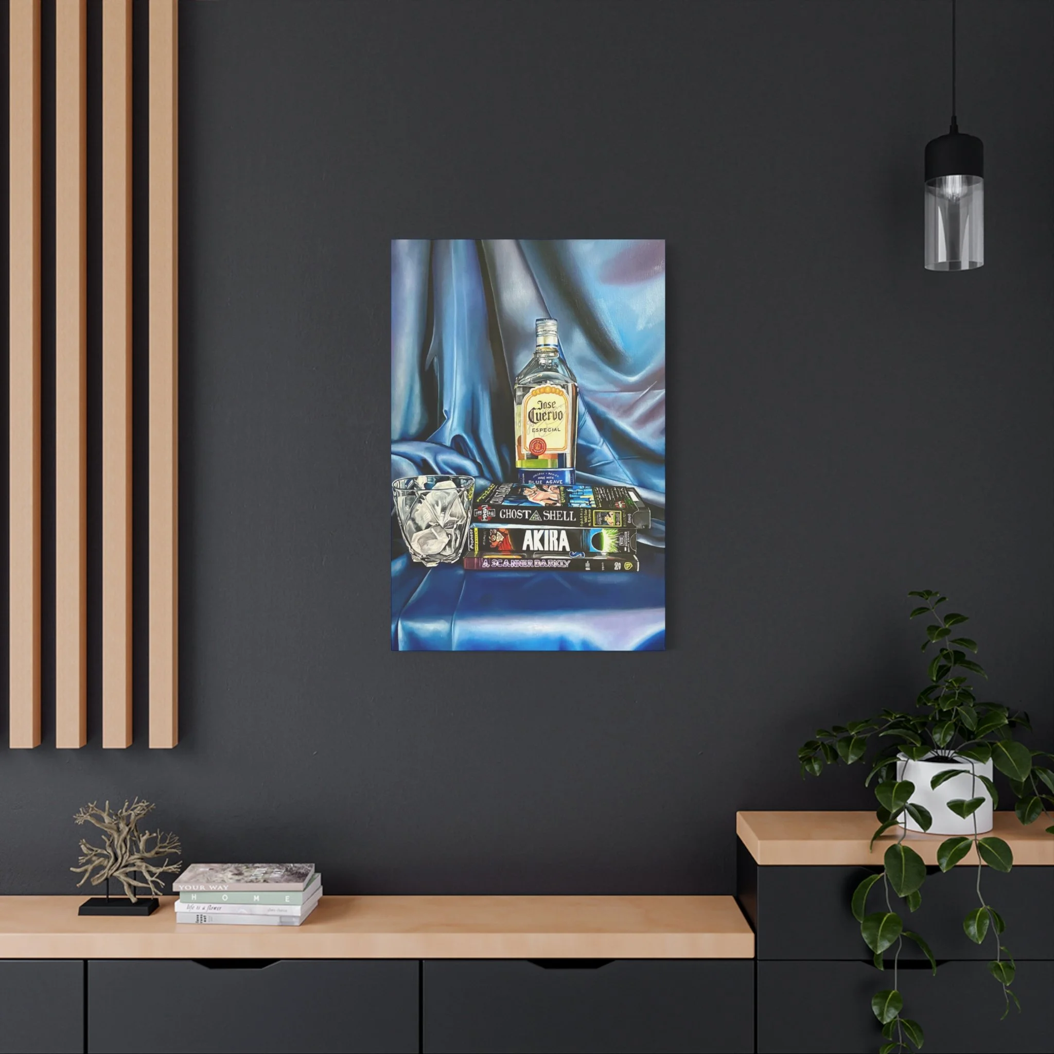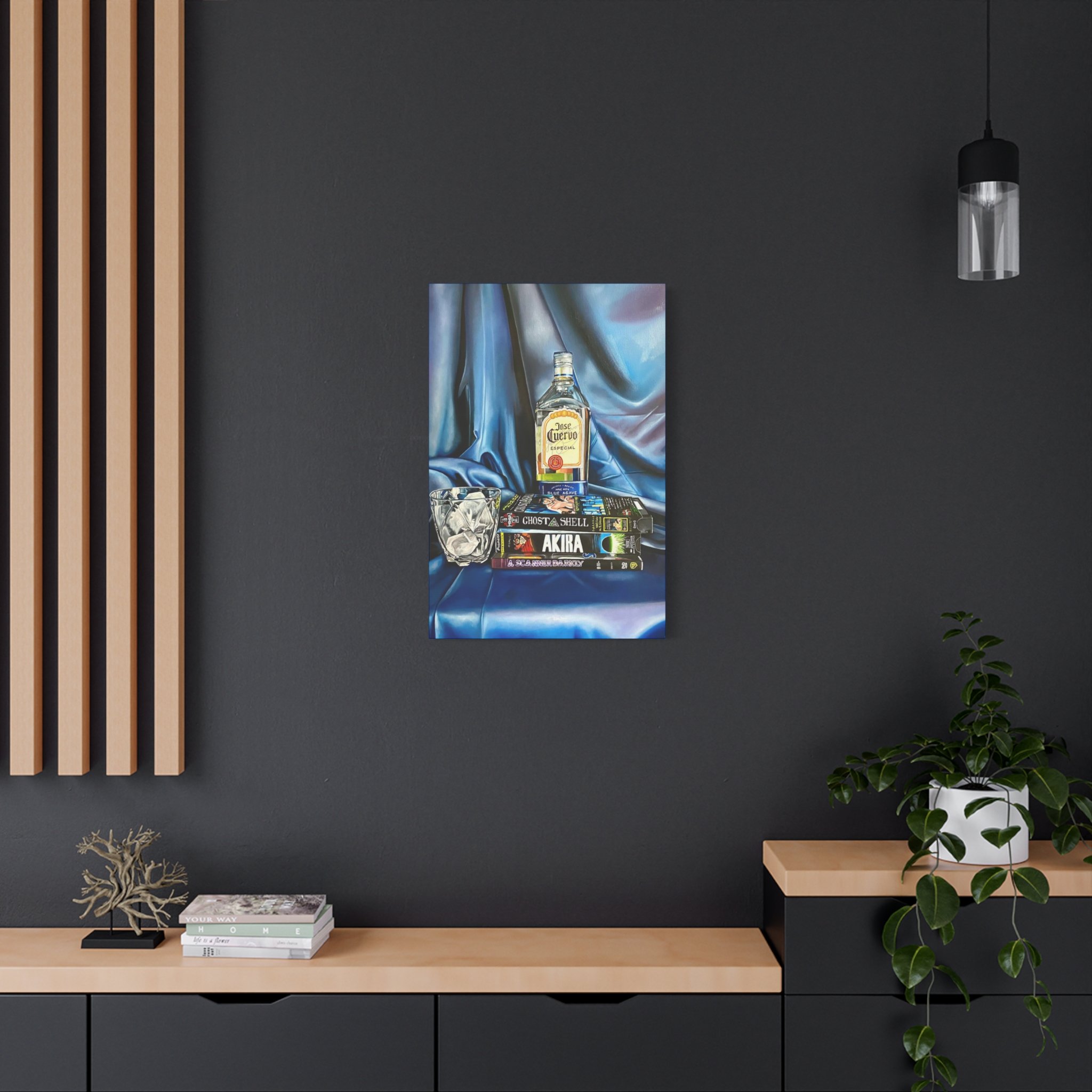 A rich, tactile canvas print that brings moody, late-night stillness into a room. The stretched matte surface softens glare and deepens the saturated blues and warm amber of the bottle and glass, creating a painting-like presence on the wall. It reads like a quiet scene after hours — stacked graphic novels, a half-full bottle, a crystal glass — and adds personality to living rooms, studios, or reading nooks. The 1.25" depth and clean gallery wrap give it presence without a heavy frame, while the soft rubber feet and included back-hanging hardware make installation simple and secure. Printed with low-VOC Greenguard Gold inks on a durable cotton-poly canvas and stretched over sustainably sourced pine, this piece balances archival quality with responsible materials.
