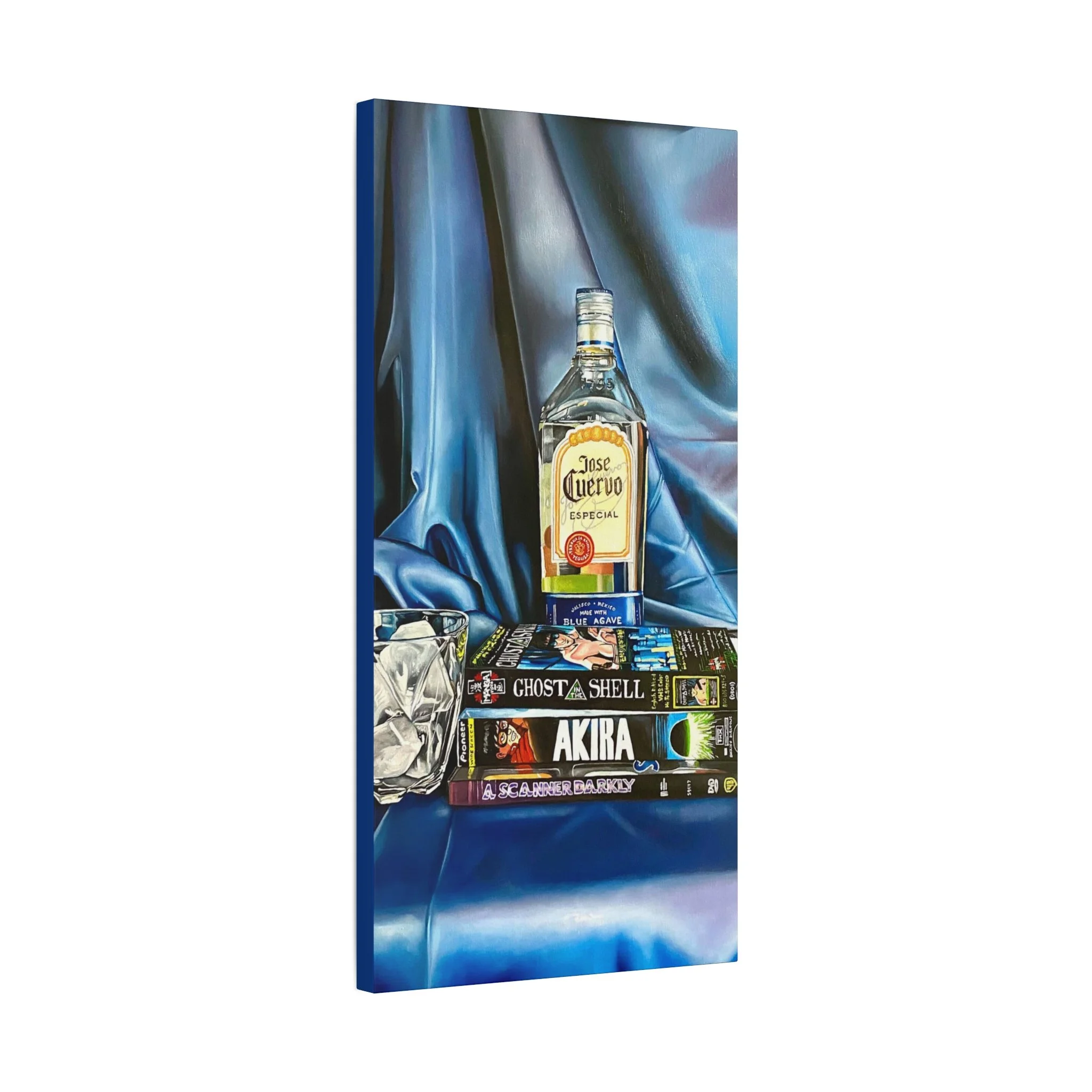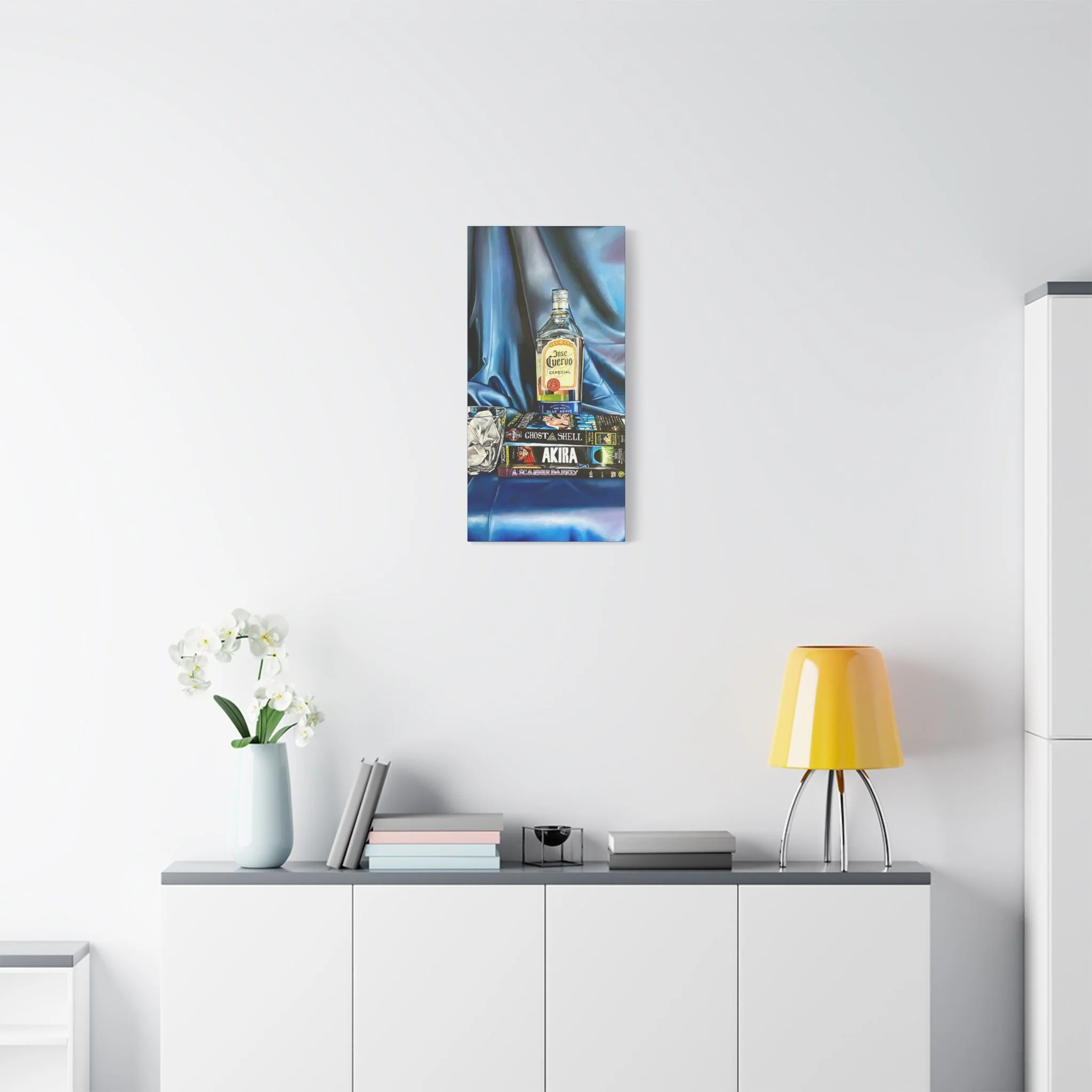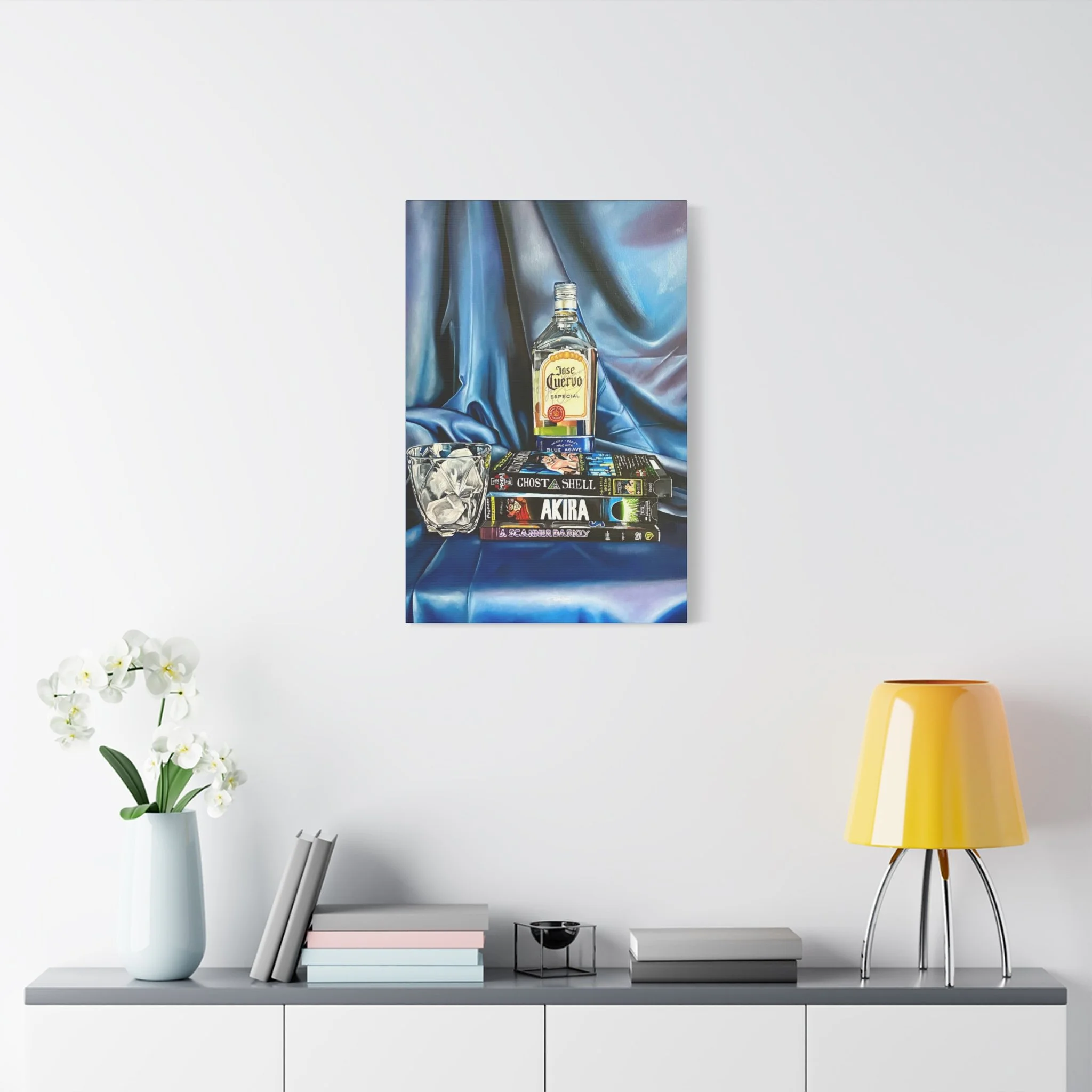 A rich, tactile canvas print that brings moody, late-night stillness into a room. The stretched matte surface softens glare and deepens the saturated blues and warm amber of the bottle and glass, creating a painting-like presence on the wall. It reads like a quiet scene after hours — stacked graphic novels, a half-full bottle, a crystal glass — and adds personality to living rooms, studios, or reading nooks. The 1.25" depth and clean gallery wrap give it presence without a heavy frame, while the soft rubber feet and included back-hanging hardware make installation simple and secure. Printed with low-VOC Greenguard Gold inks on a durable cotton-poly canvas and stretched over sustainably sourced pine, this piece balances archival quality with responsible materials.