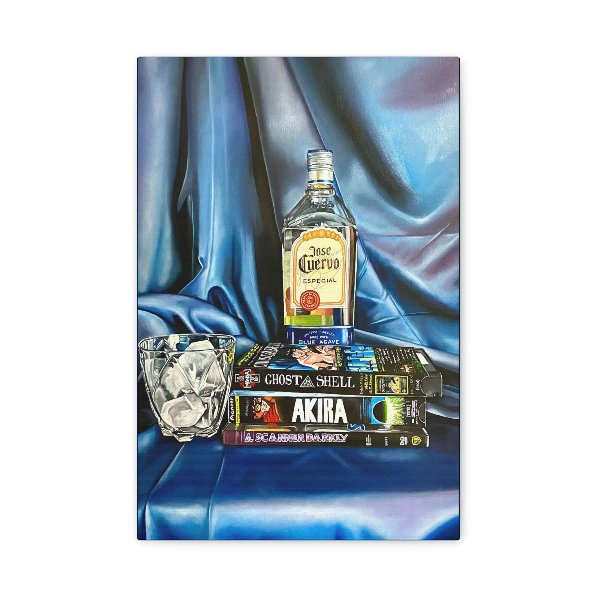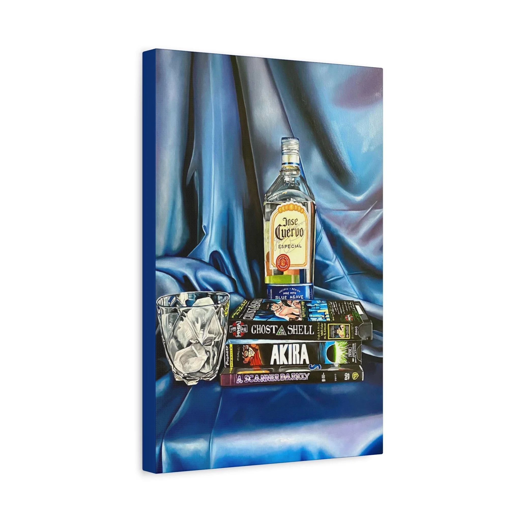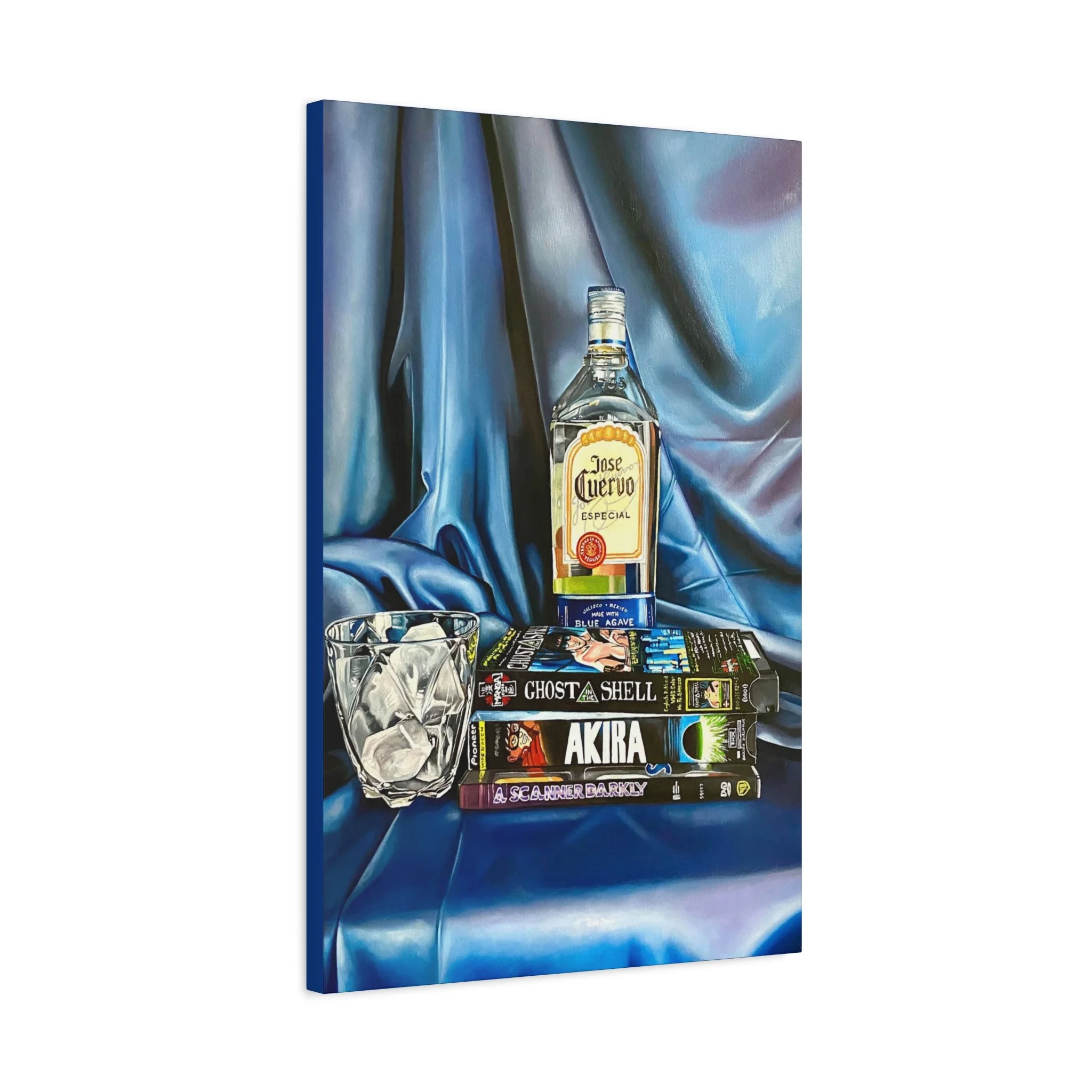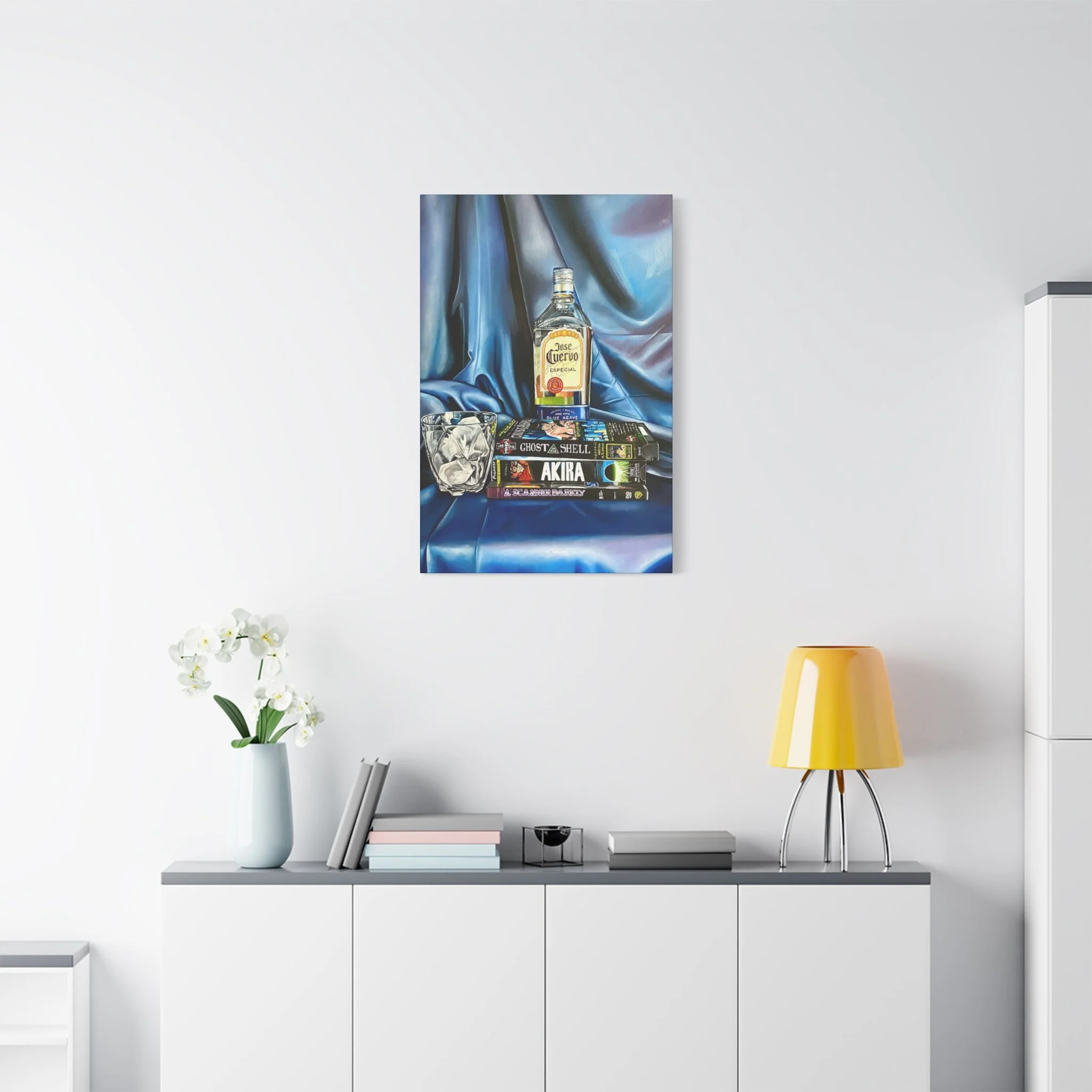 A rich, tactile canvas print that brings moody, late-night stillness into a room. The stretched matte surface softens glare and deepens the saturated blues and warm amber of the bottle and glass, creating a painting-like presence on the wall. It reads like a quiet scene after hours — stacked graphic novels, a half-full bottle, a crystal glass — and adds personality to living rooms, studios, or reading nooks. The 1.25" depth and clean gallery wrap give it presence without a heavy frame, while the soft rubber feet and included back-hanging hardware make installation simple and secure. Printed with low-VOC Greenguard Gold inks on a durable cotton-poly canvas and stretched over sustainably sourced pine, this piece balances archival quality with responsible materials.