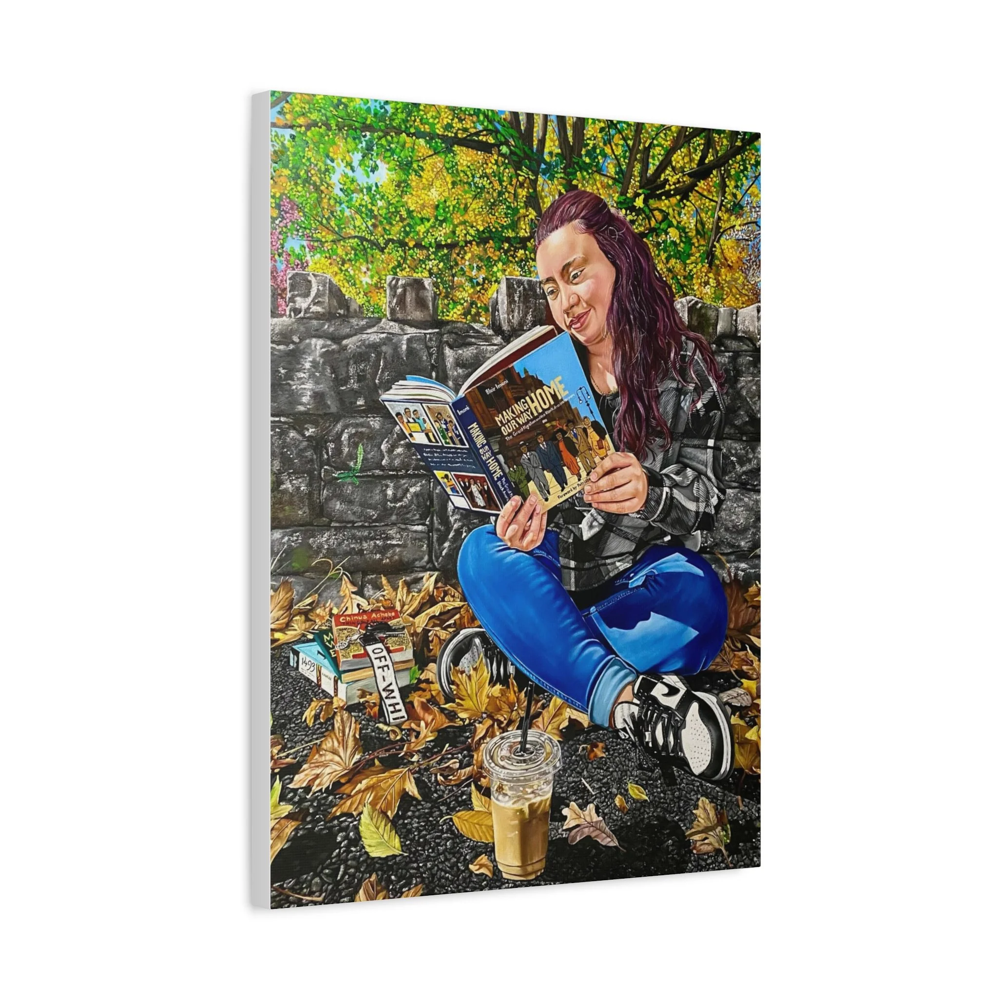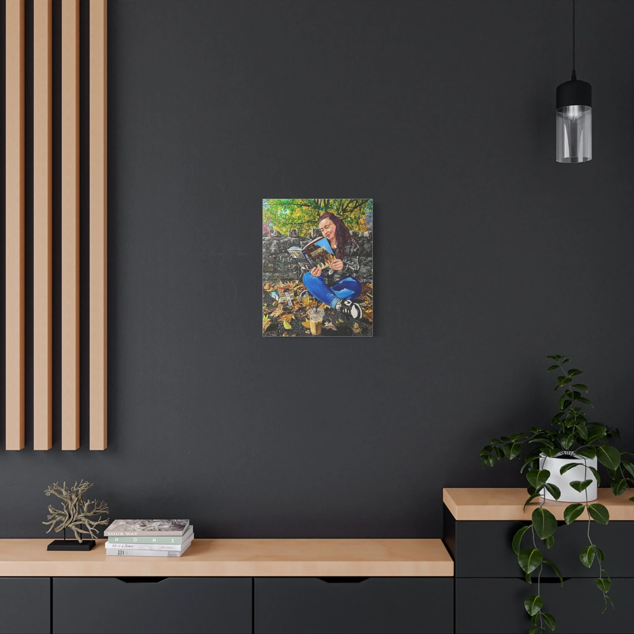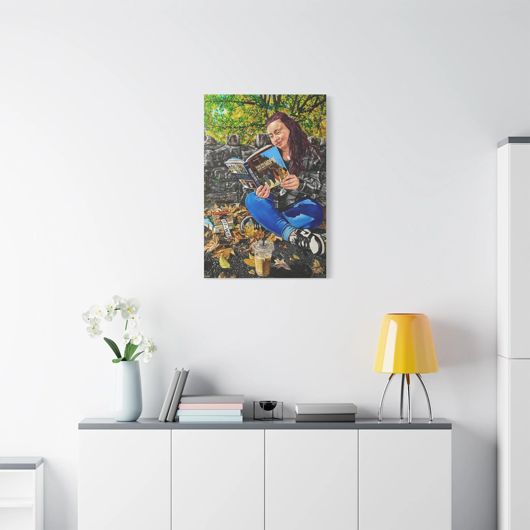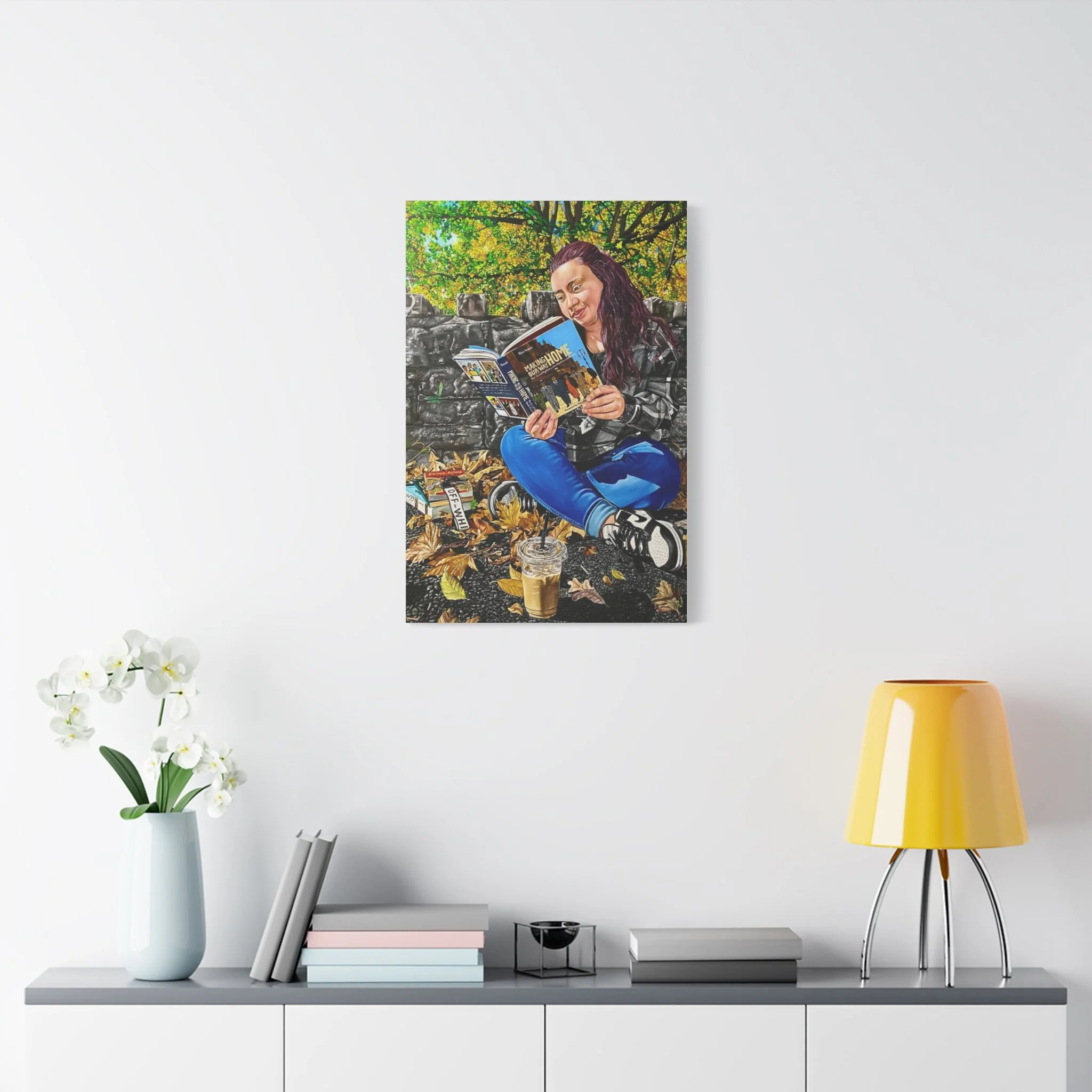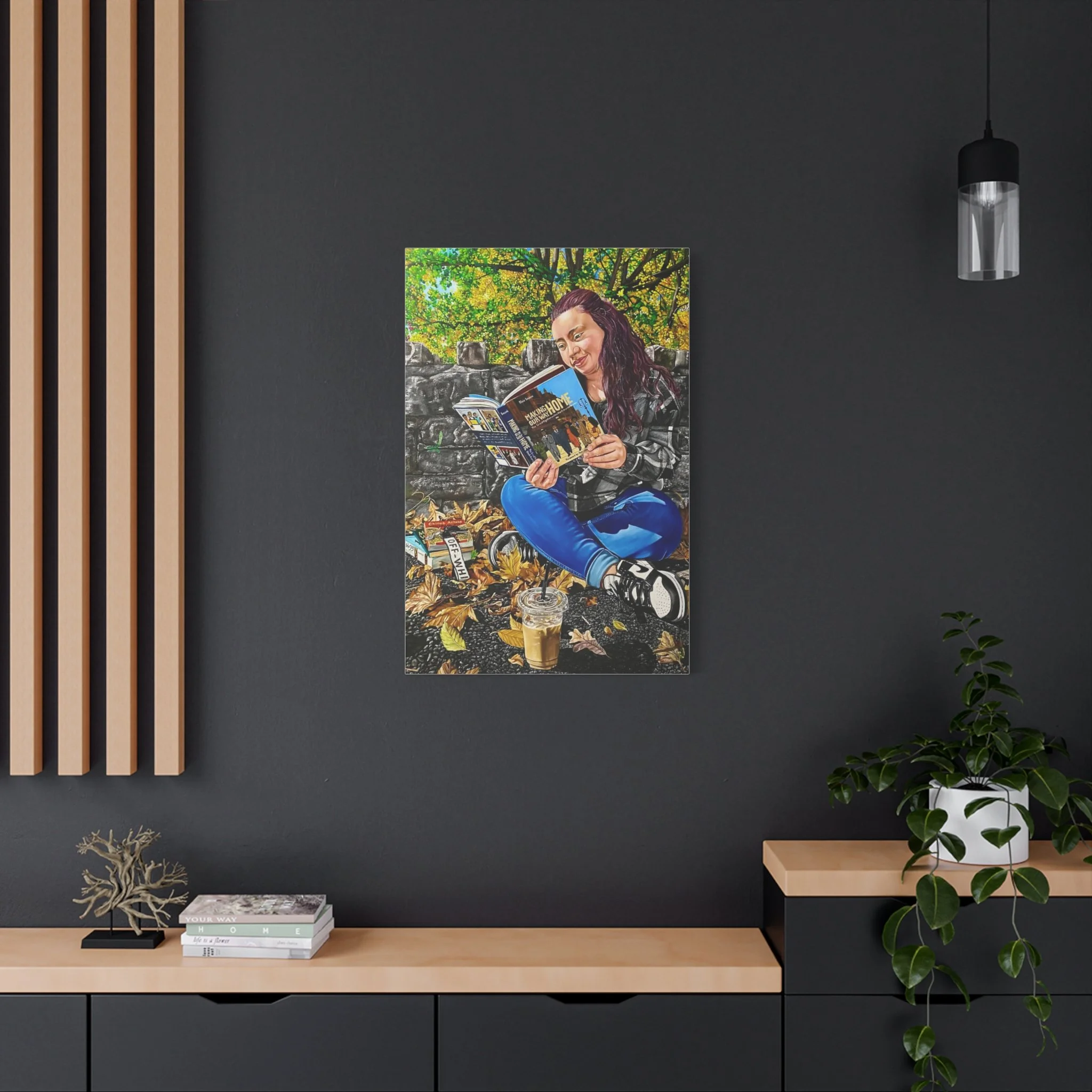 A stretched matte canvas print that brings a quiet, bookish afternoon to your wall. The scene captures a reader seated on autumn leaves against a stone wall, coffee at their side and paperback worlds spilling around them. Colors are warm and textured, with rich fall greens and ochres framed by the subtle depth of the stretched edge. The matte finish reduces glare and highlights brush-like detail and fine grain, making the image feel like a painted moment frozen in time. Ready to hang with a clean, gallery-style profile that anchors living rooms, reading nooks, or creative studios with a calm, reflective energy.