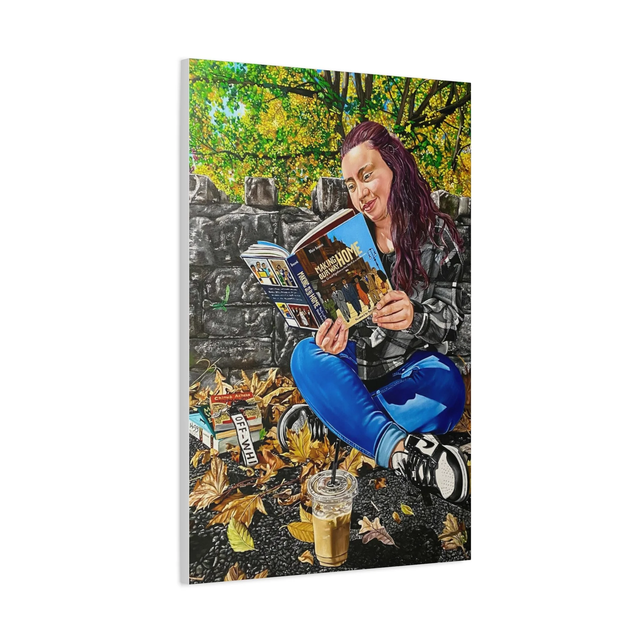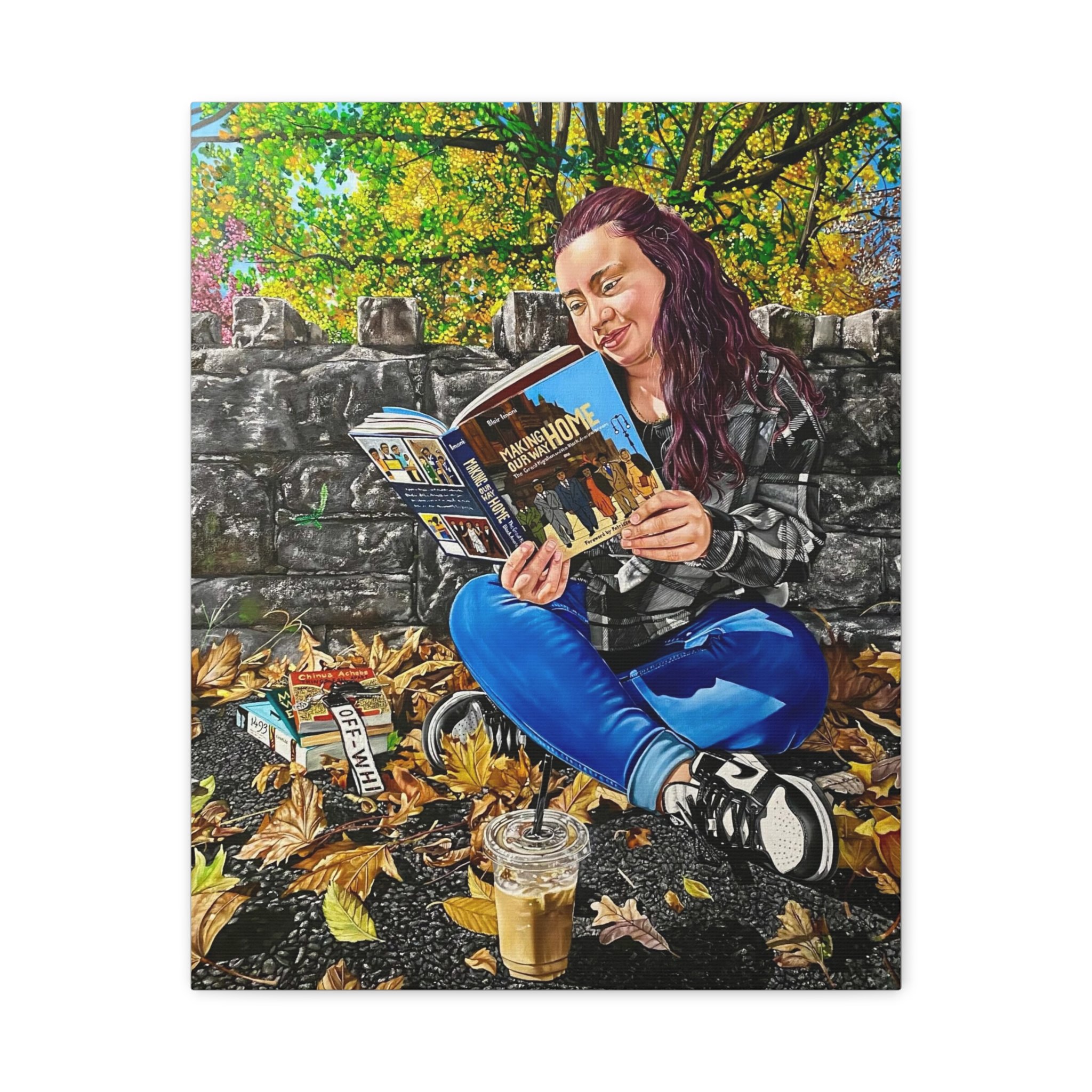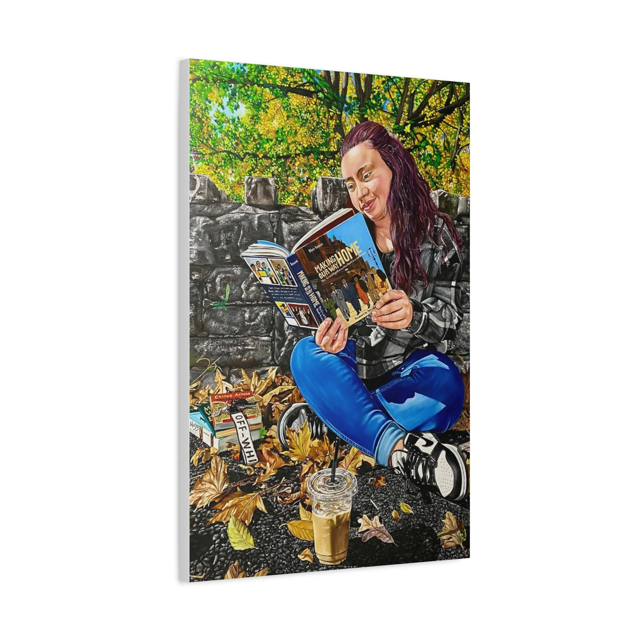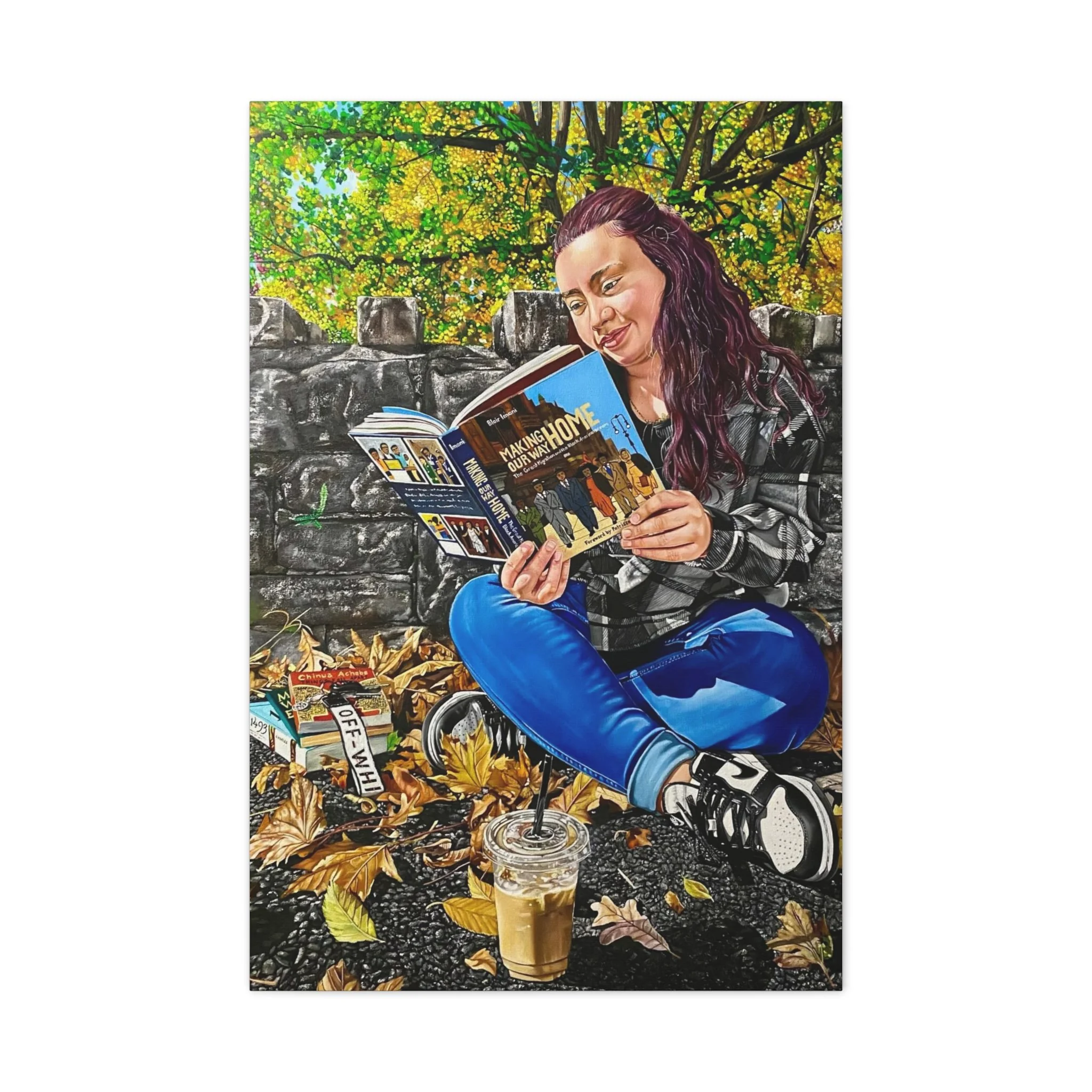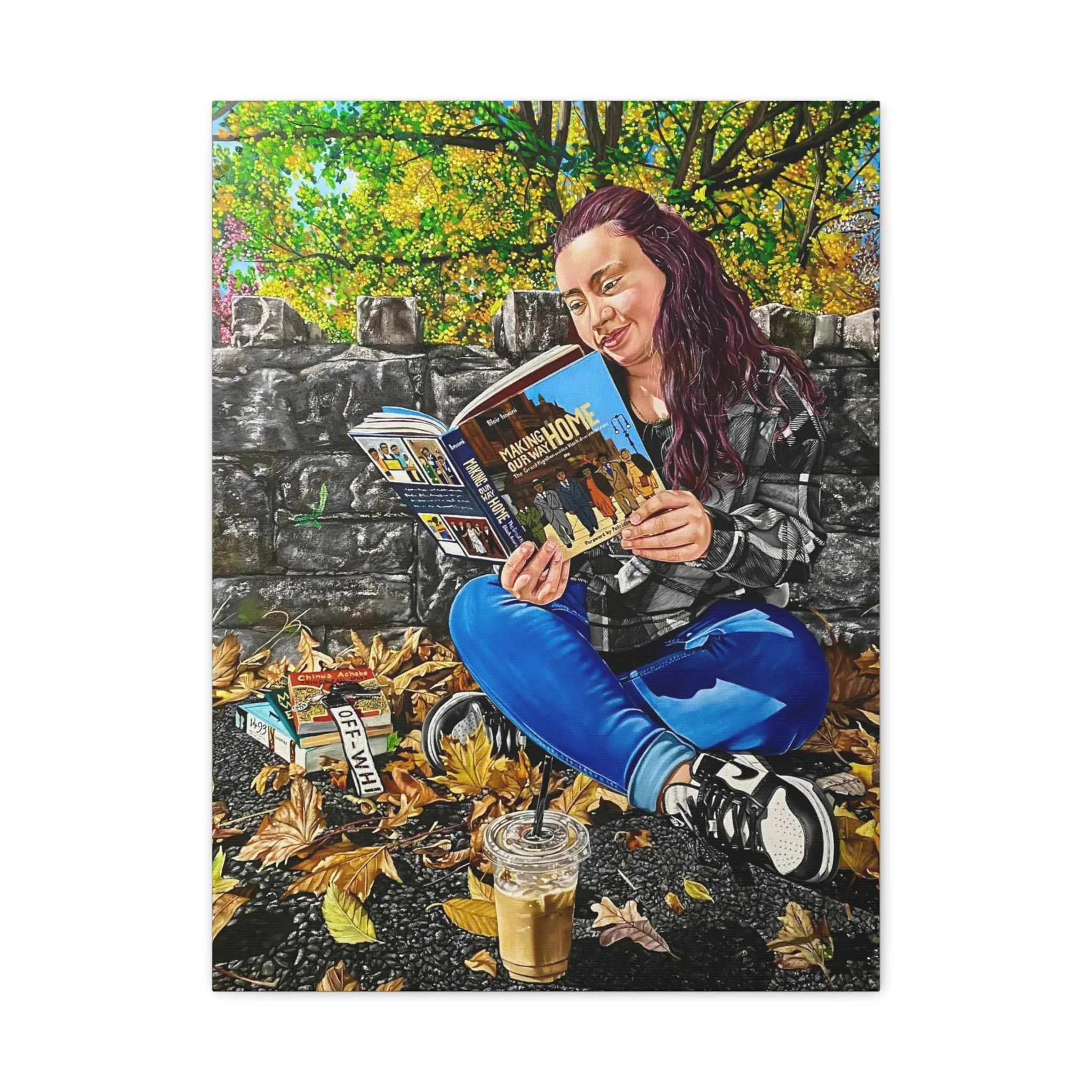 A stretched matte canvas print that brings a quiet, bookish afternoon to your wall. The scene captures a reader seated on autumn leaves against a stone wall, coffee at their side and paperback worlds spilling around them. Colors are warm and textured, with rich fall greens and ochres framed by the subtle depth of the stretched edge. The matte finish reduces glare and highlights brush-like detail and fine grain, making the image feel like a painted moment frozen in time. Ready to hang with a clean, gallery-style profile that anchors living rooms, reading nooks, or creative studios with a calm, reflective energy.