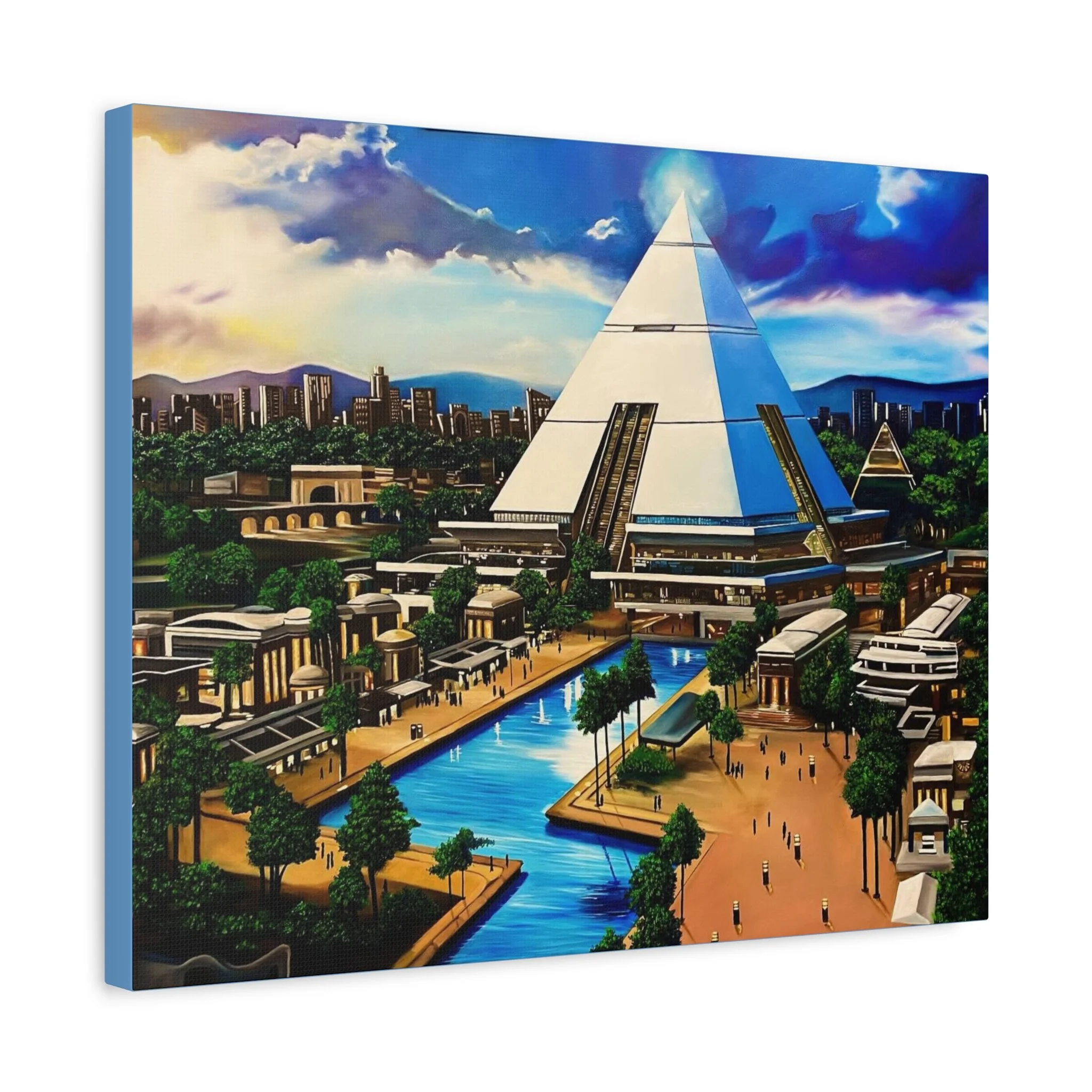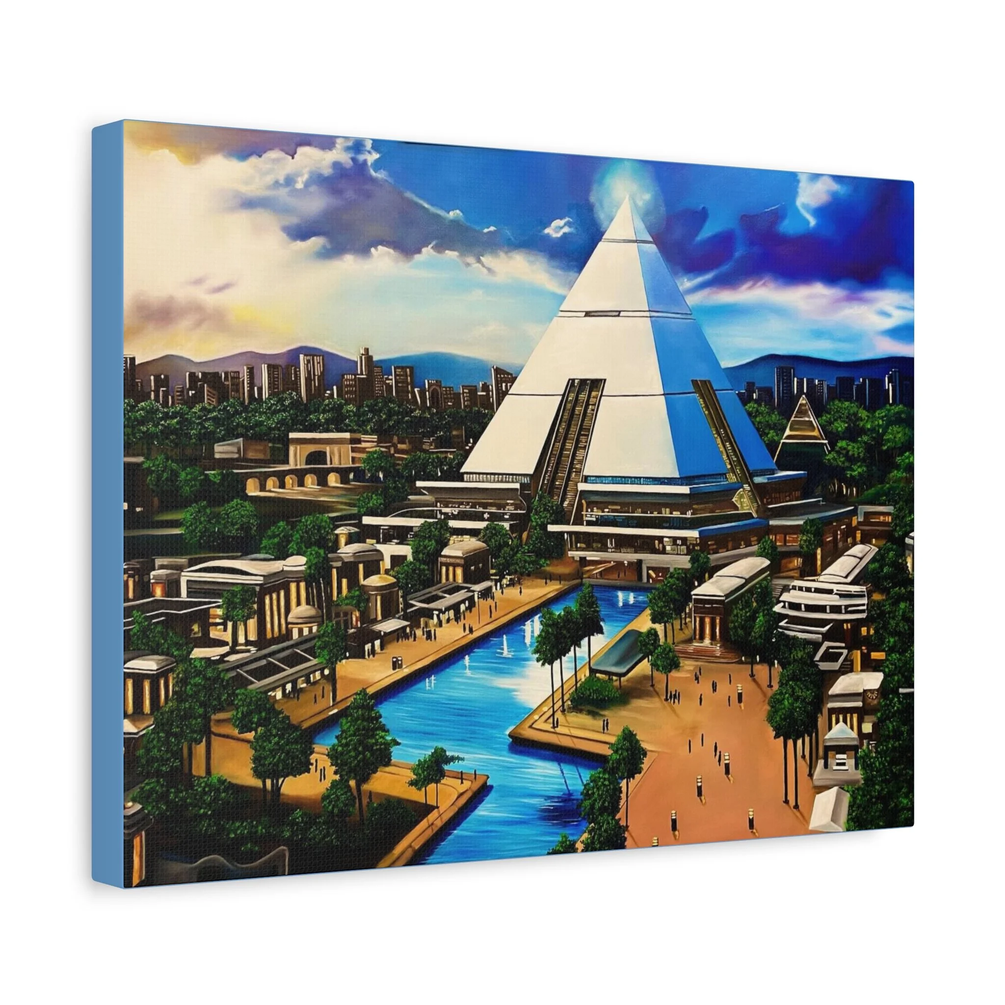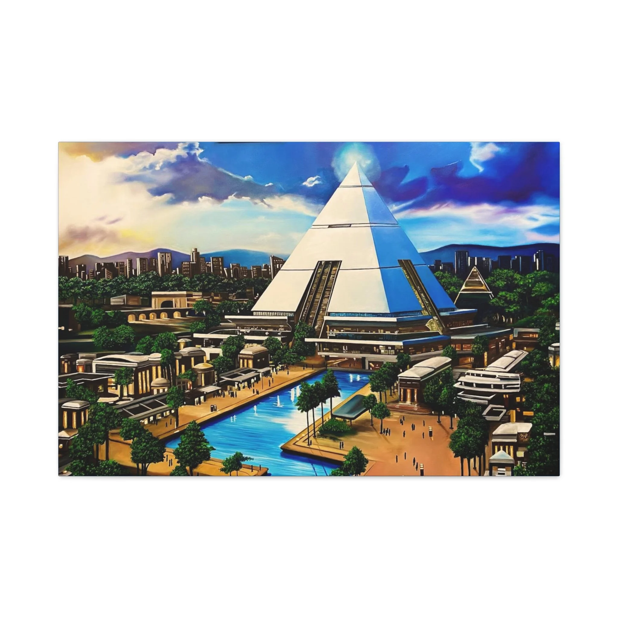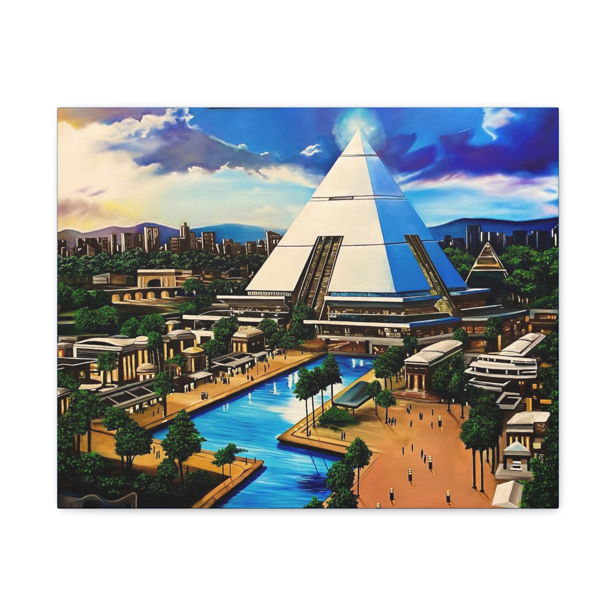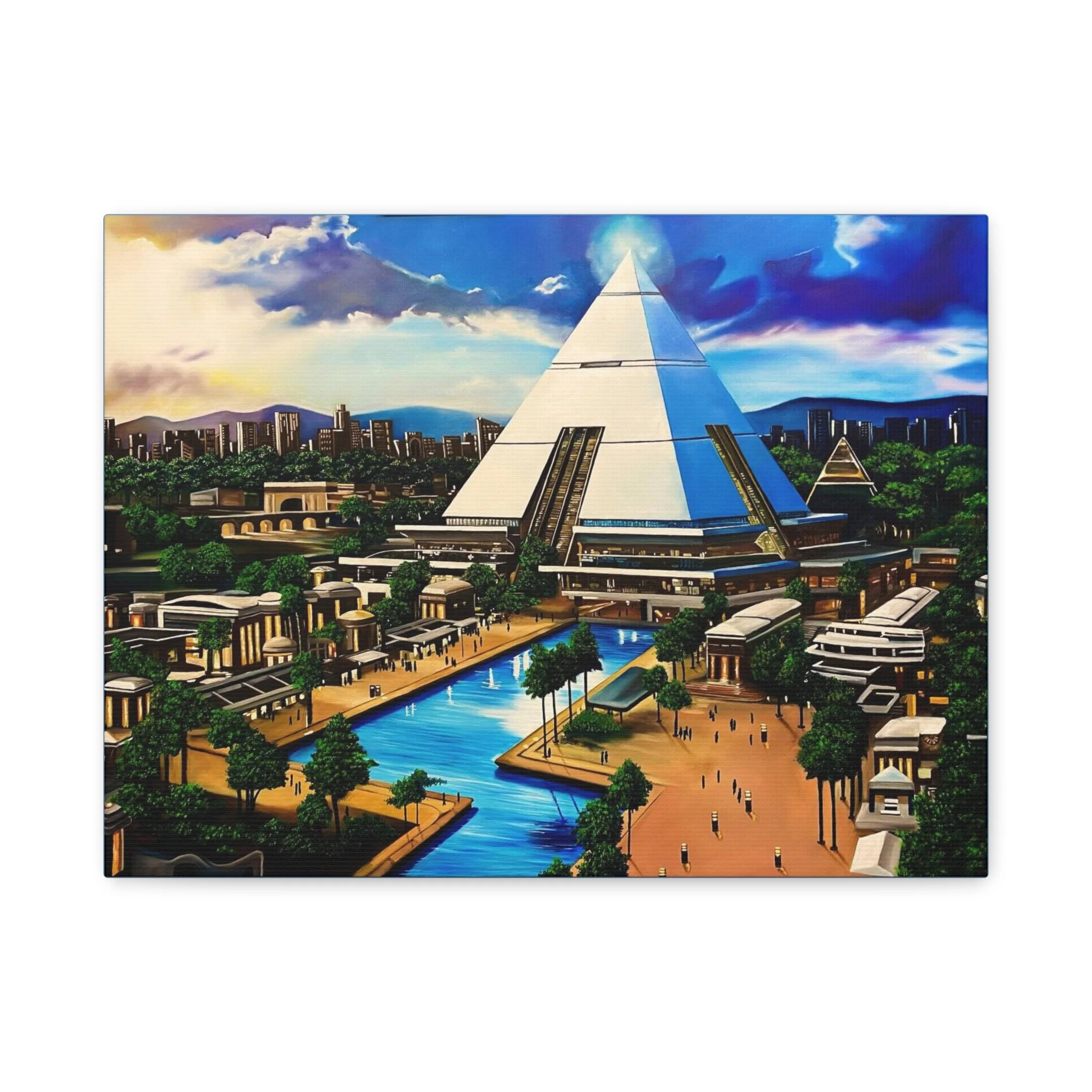 This matte stretched canvas brings a sunlit, futuristic cityscape into your room with painterly color and crisp detail. The large pyramid at the center draws the eye, while canals, palm-lined promenades, and low-rise structures create a calm, lived-in world. Hang it over a sofa, in a study, or on a hallway wall to introduce a sense of exploration and quiet wonder. The flat matte finish keeps reflections low so the image reads clearly from across the room, and the lightly textured canvas adds a tactile quality that complements modern and eclectic decor alike.