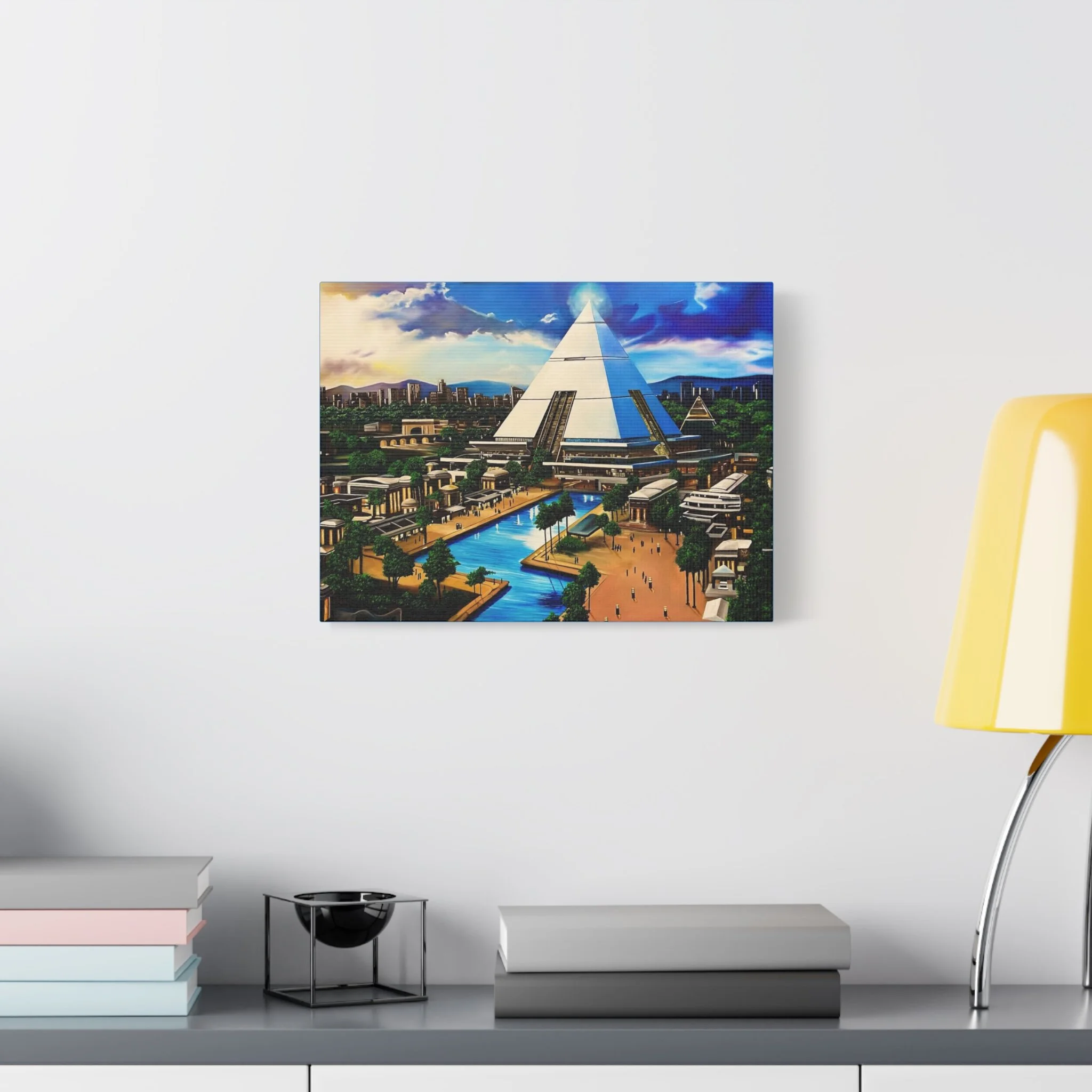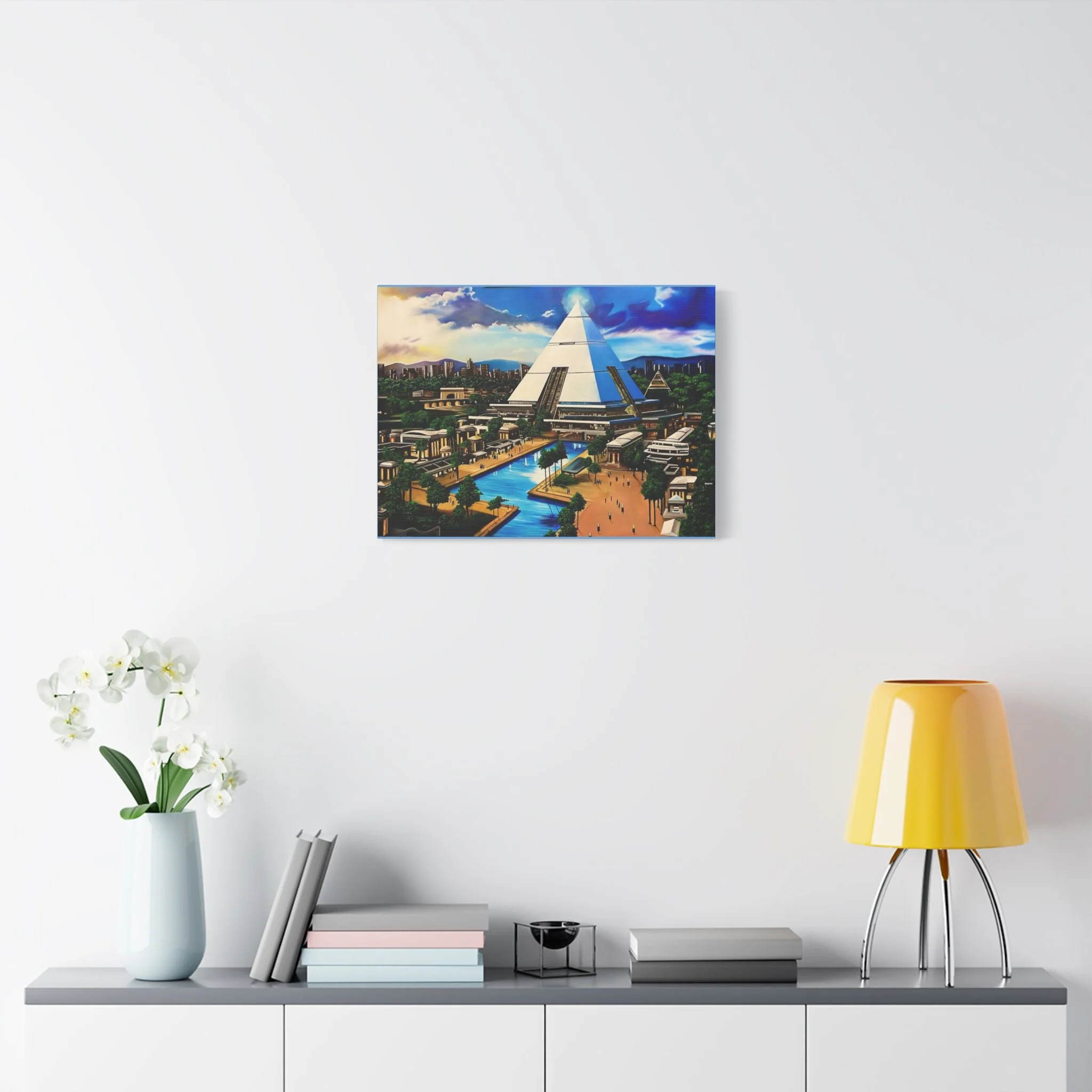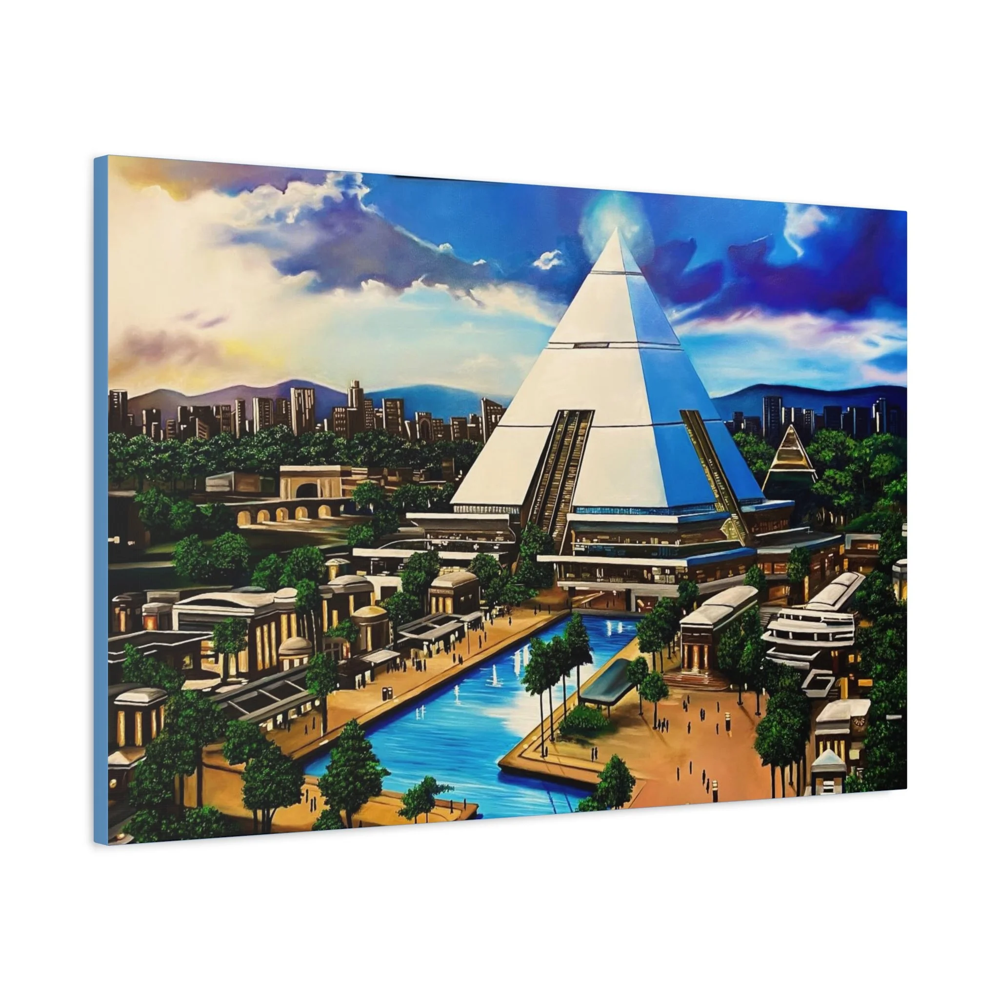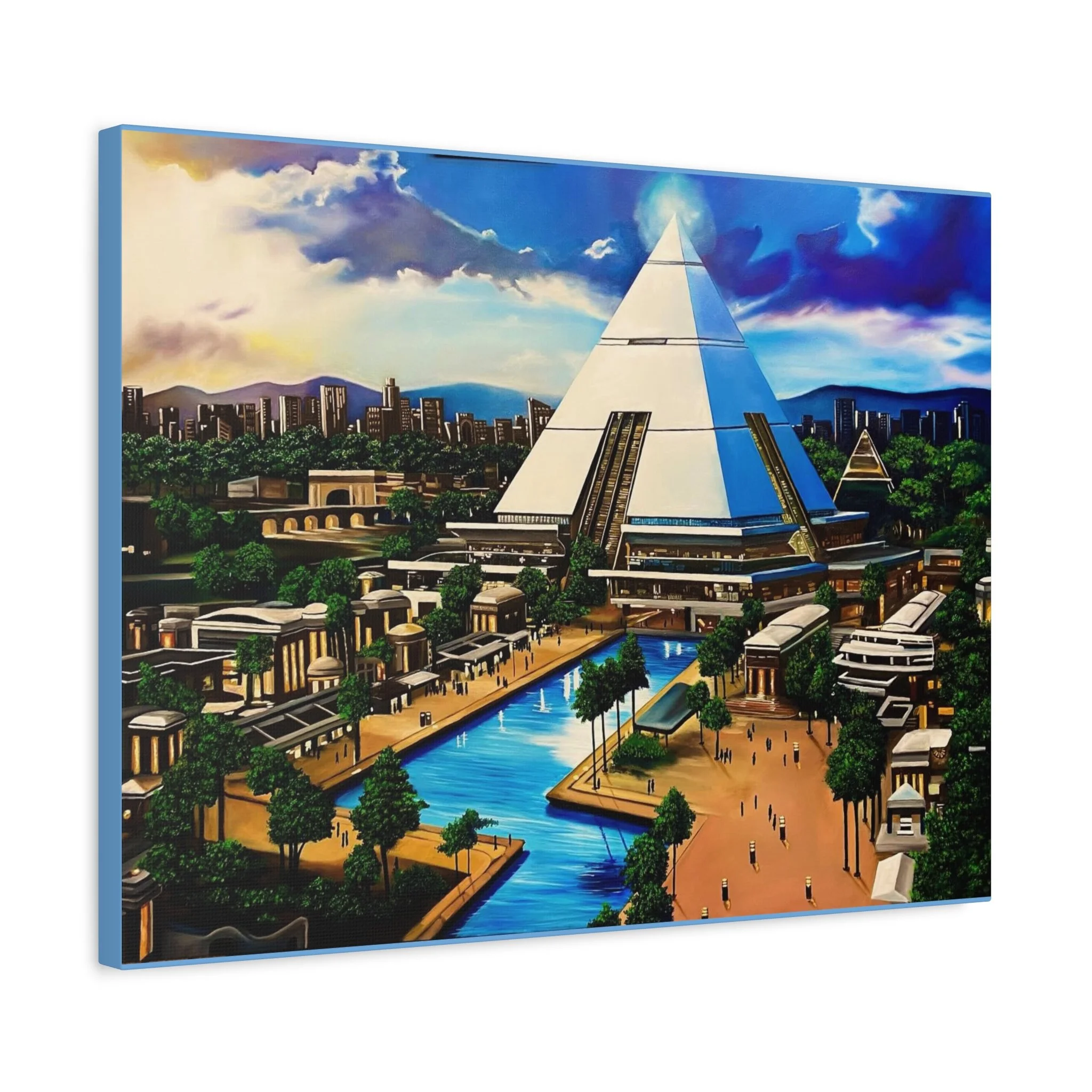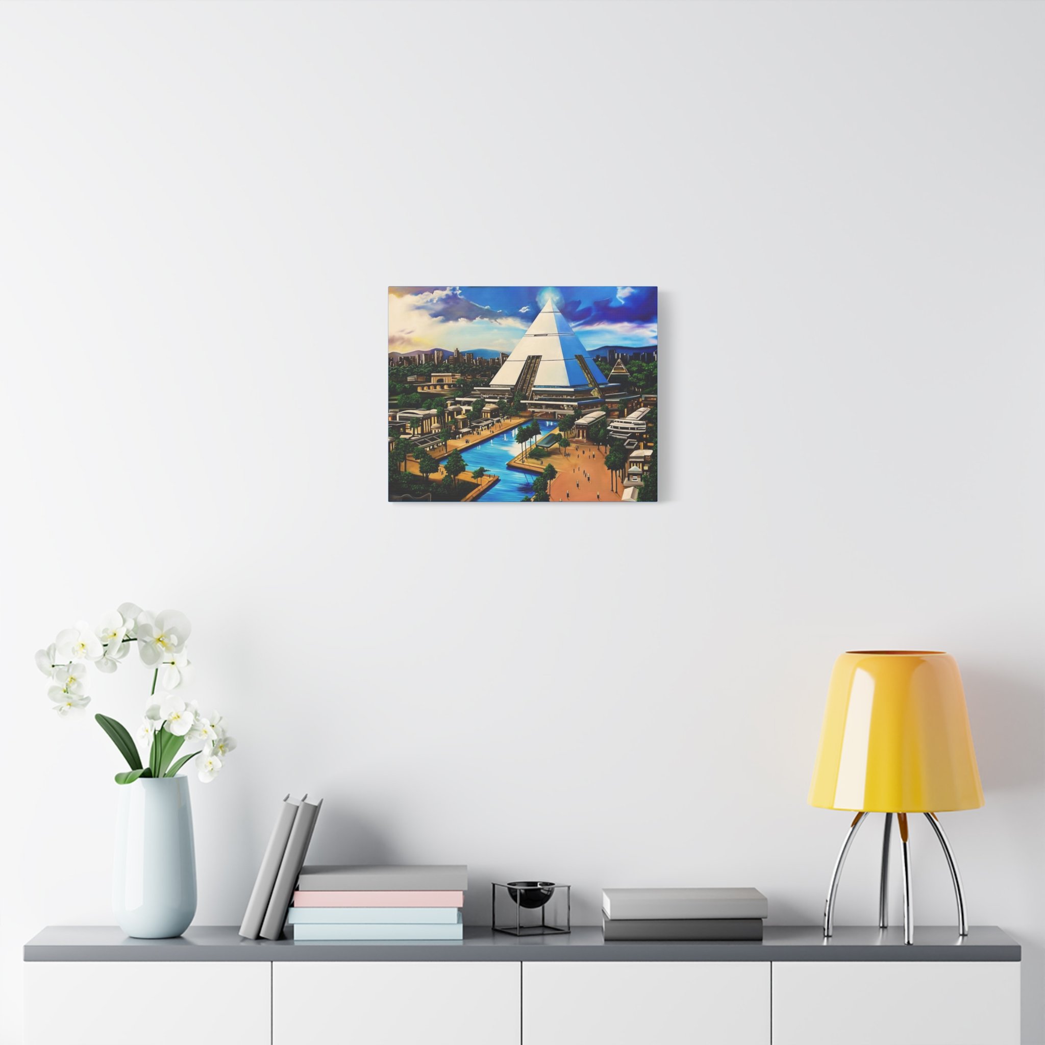 This matte stretched canvas brings a sunlit, futuristic cityscape into your room with painterly color and crisp detail. The large pyramid at the center draws the eye, while canals, palm-lined promenades, and low-rise structures create a calm, lived-in world. Hang it over a sofa, in a study, or on a hallway wall to introduce a sense of exploration and quiet wonder. The flat matte finish keeps reflections low so the image reads clearly from across the room, and the lightly textured canvas adds a tactile quality that complements modern and eclectic decor alike.