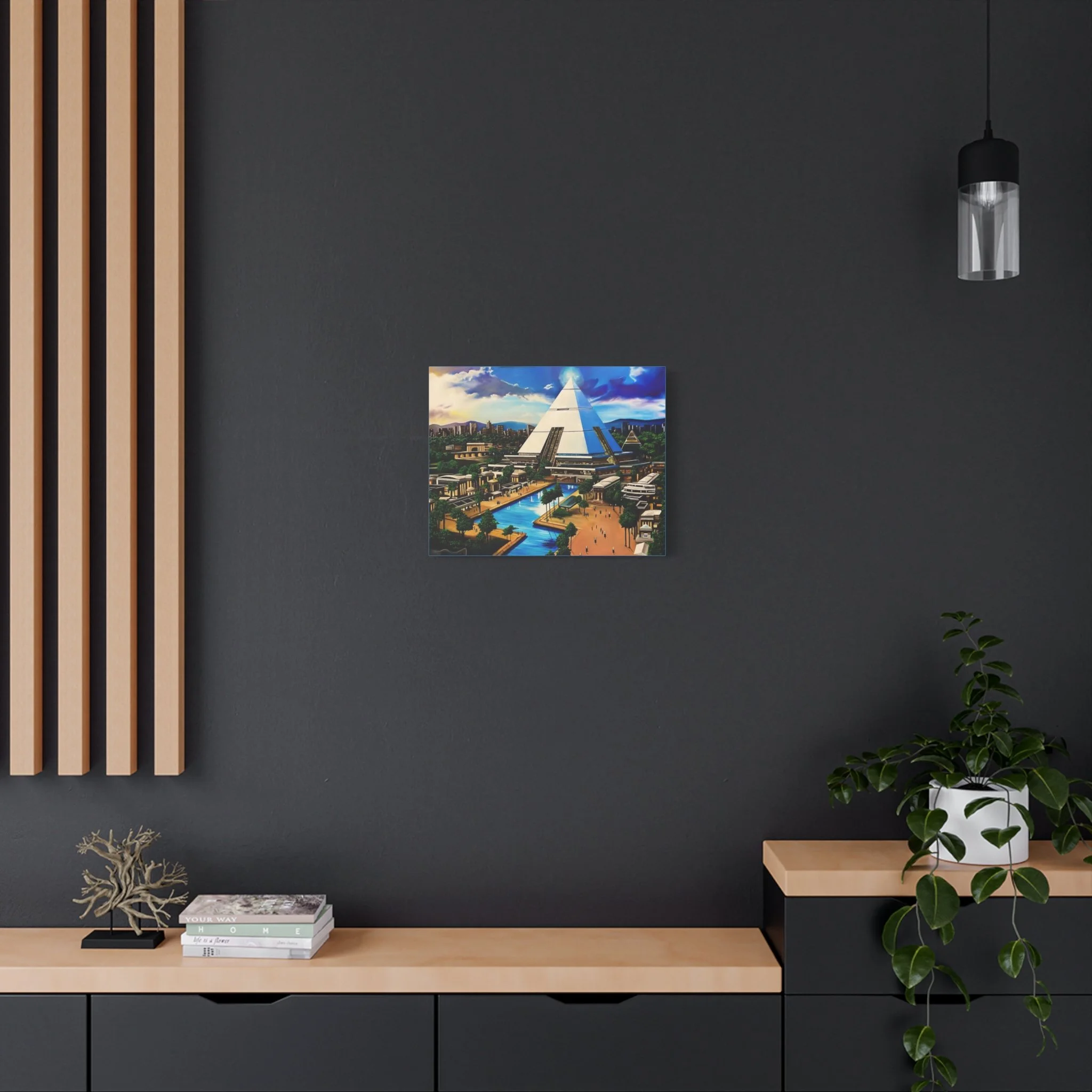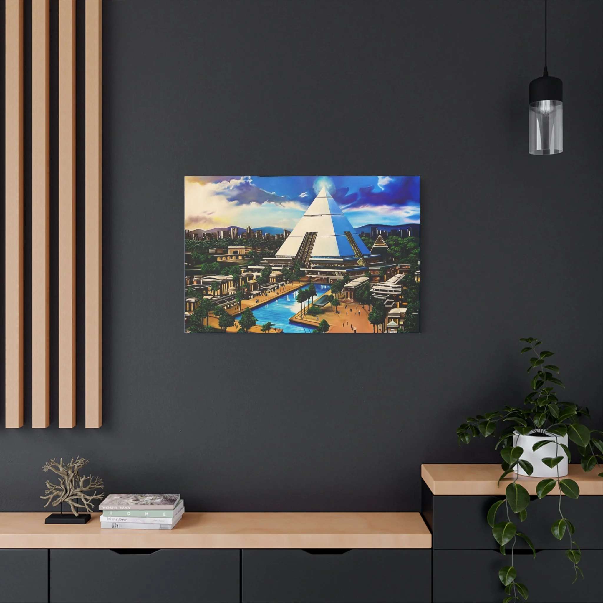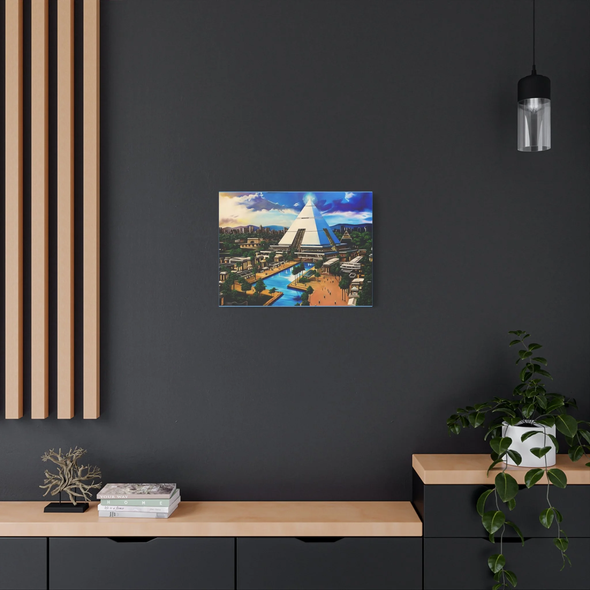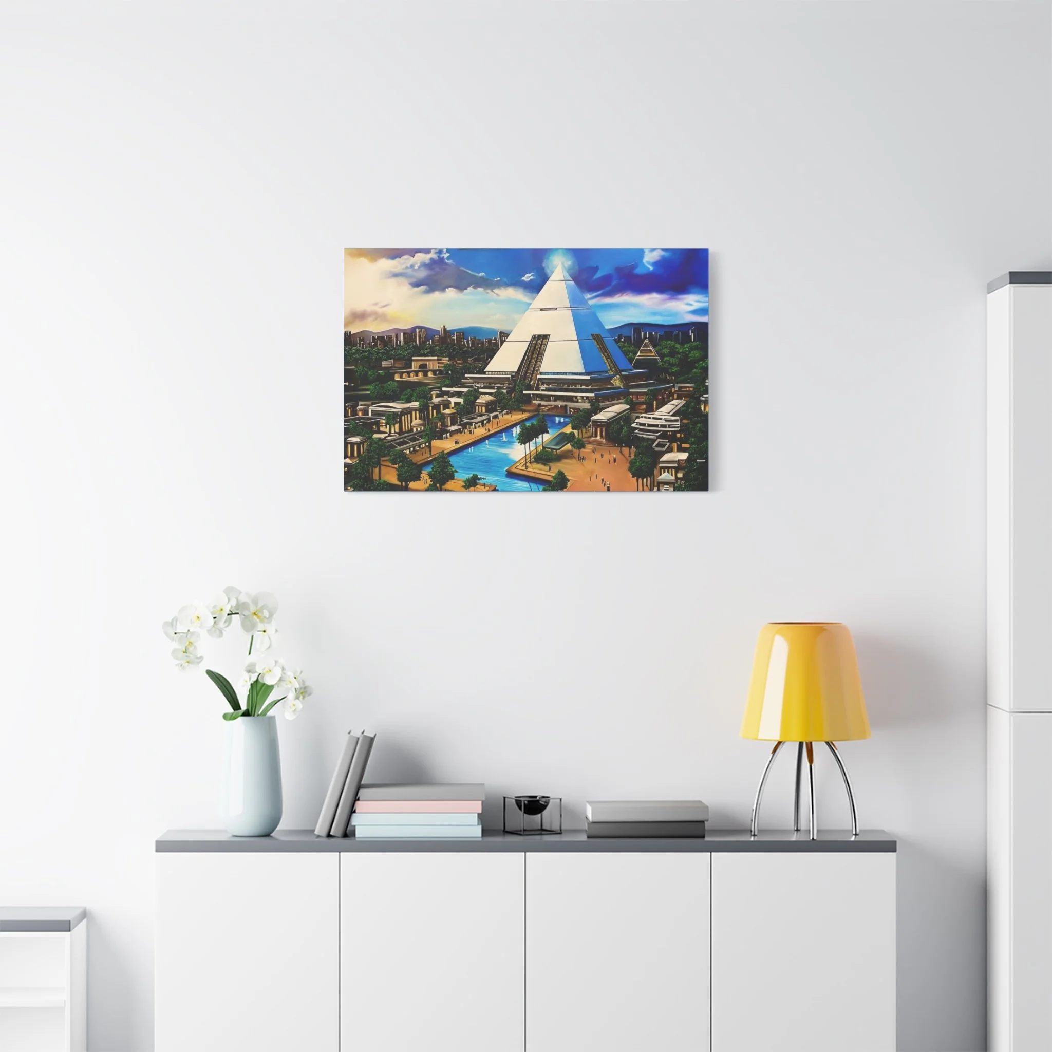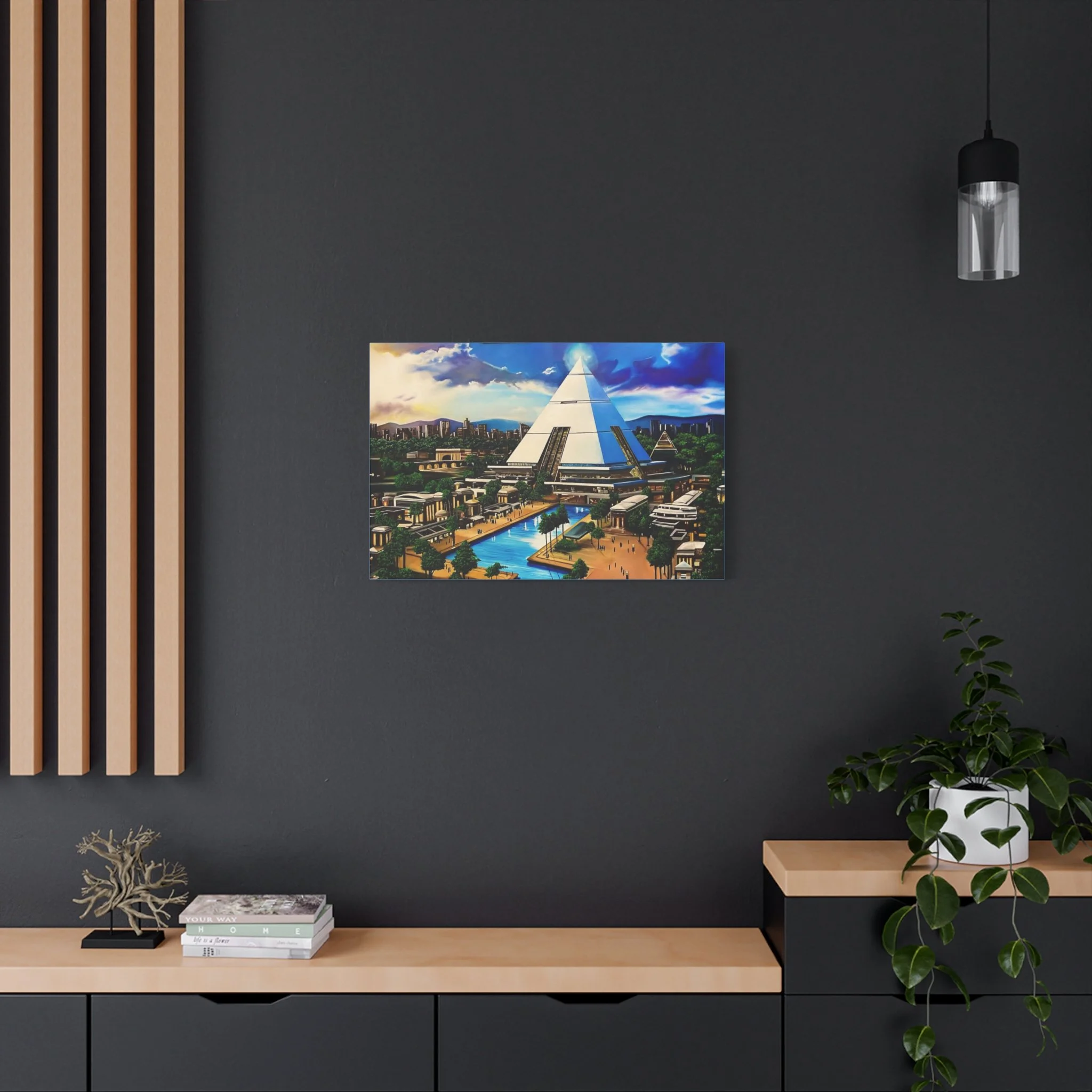 This matte stretched canvas brings a sunlit, futuristic cityscape into your room with painterly color and crisp detail. The large pyramid at the center draws the eye, while canals, palm-lined promenades, and low-rise structures create a calm, lived-in world. Hang it over a sofa, in a study, or on a hallway wall to introduce a sense of exploration and quiet wonder. The flat matte finish keeps reflections low so the image reads clearly from across the room, and the lightly textured canvas adds a tactile quality that complements modern and eclectic decor alike.